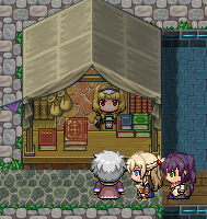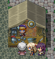 Heading east, you will come across the shopping district, where the , item shop, bookstore, weapon shop, magic shop and moneylender are located.