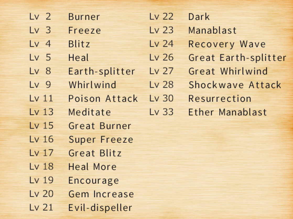 Sells consumable items or items for slave training. Also allows you to appraise depleted gems in order to restore them in exchange for a sum of 300G each. Also has a back room where you can create custom magic.