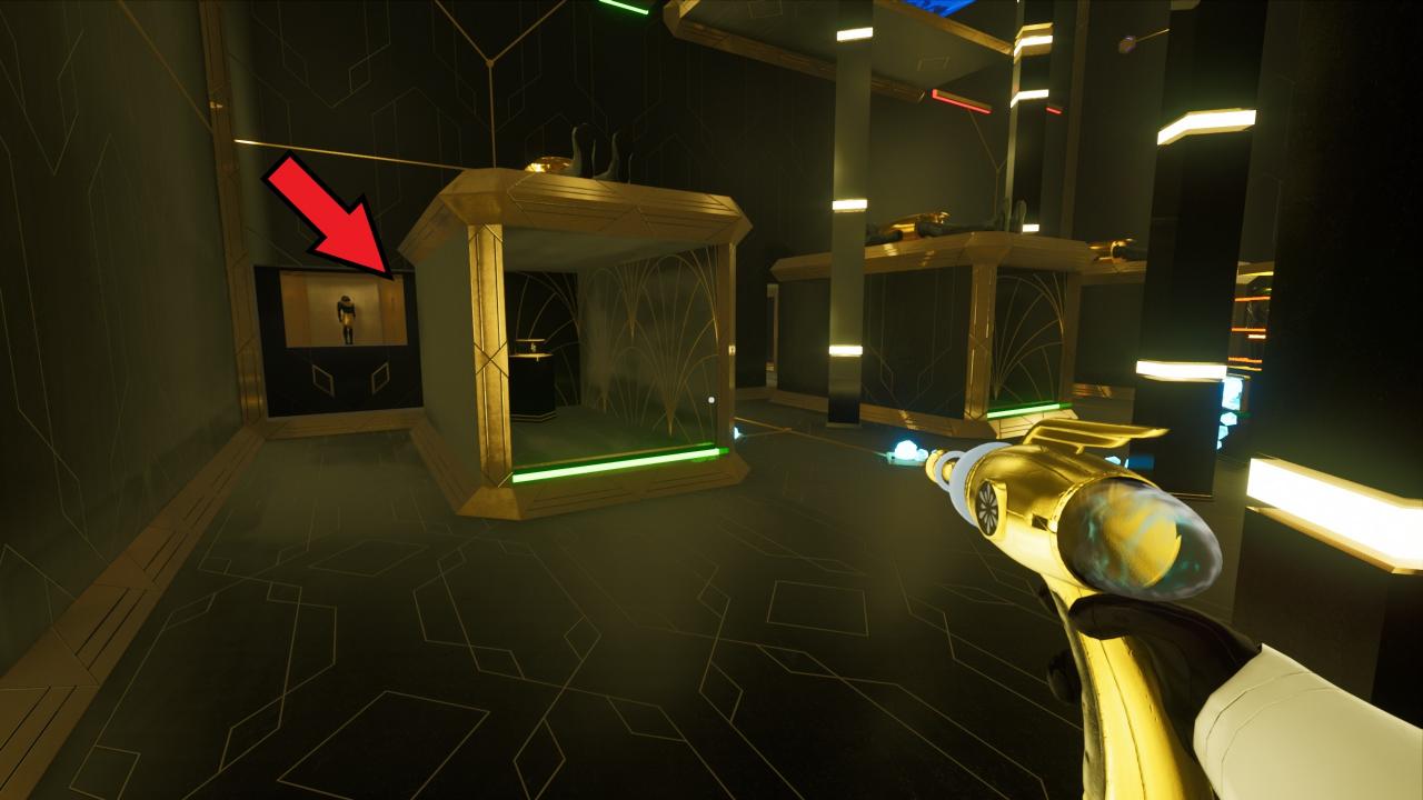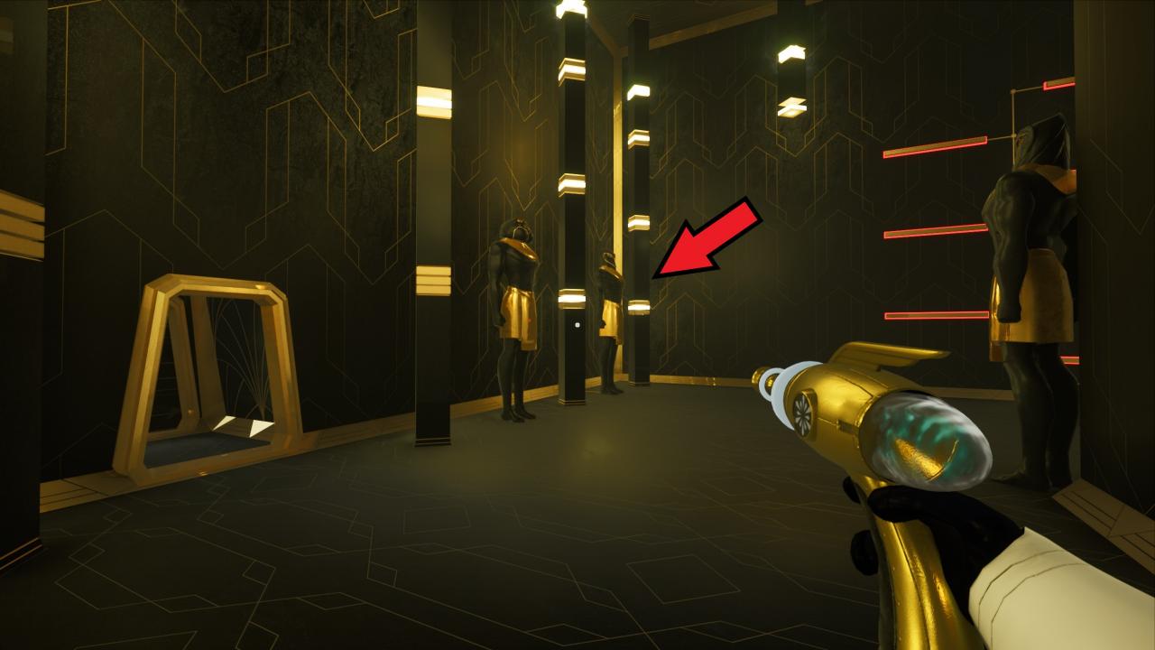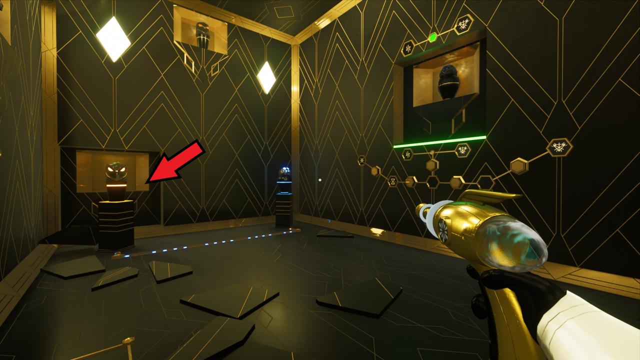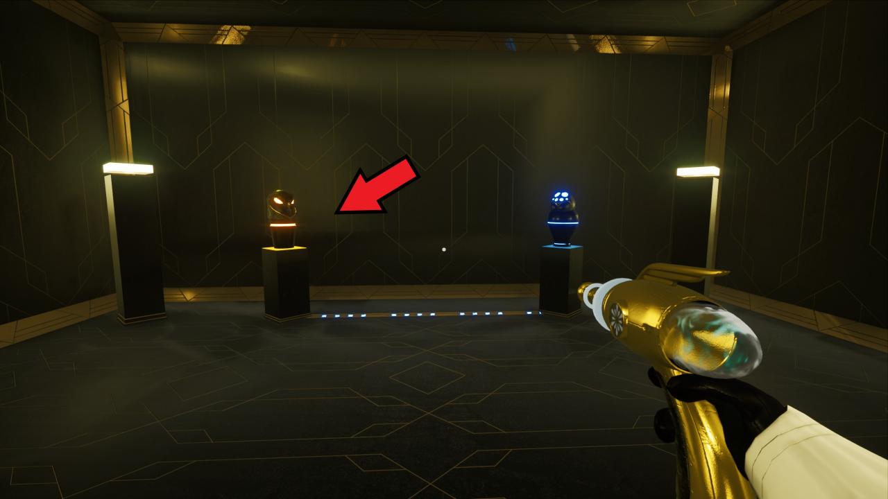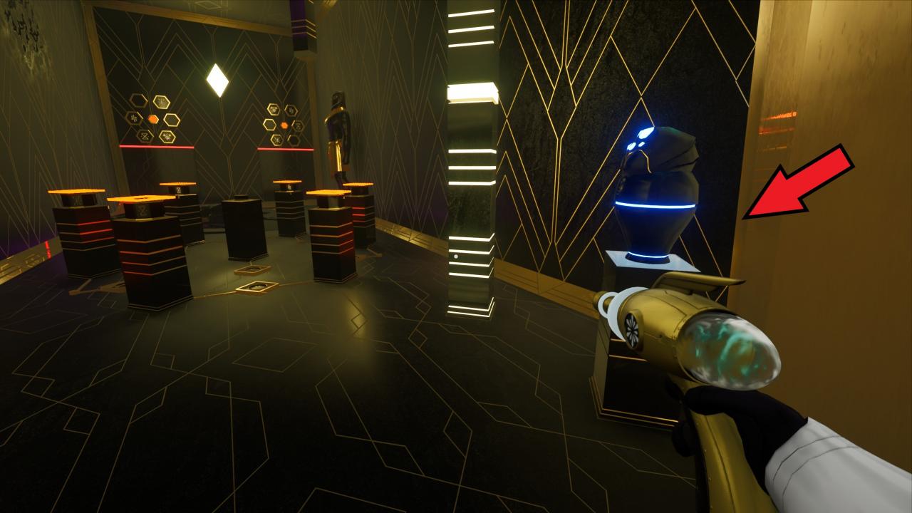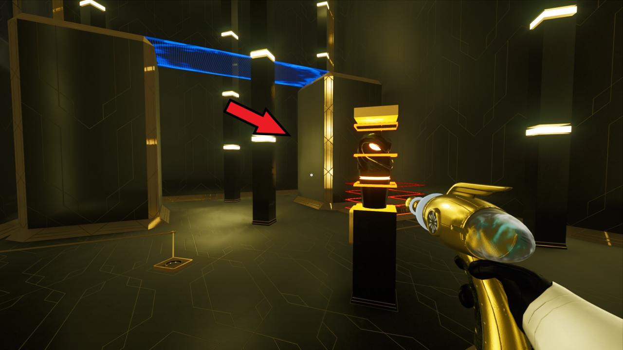In the room on the right, press the hidden button behind the red statue (must be active):