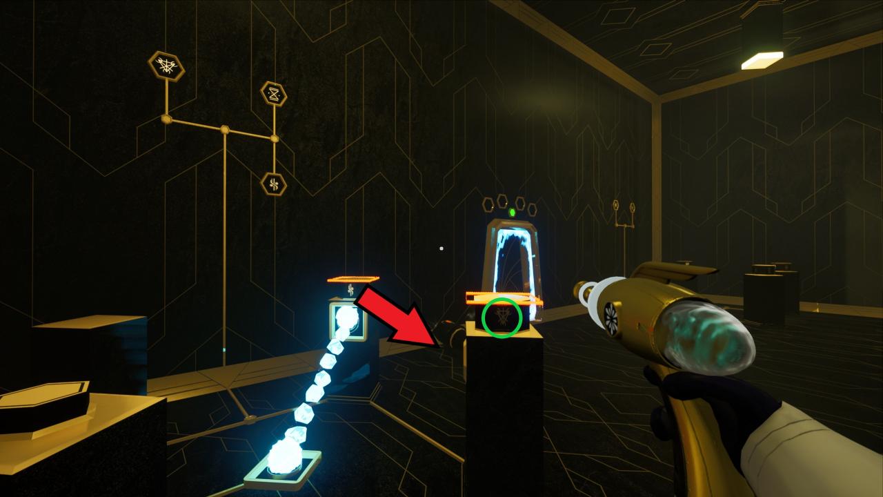 Interact with the broken puzzle in the second room (get the blue power from the previous room):