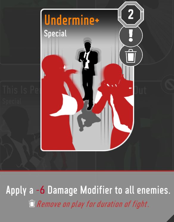 This enhancement is VERY good. It might not sound like much especially in the late game when enemies can hit for 20+ damage… but there are also a lot of enemies who hit multiple times for small damage. For example, the infamous purple mohawk Rifleman. He can auto-attack three times for 8 damage each! Well, with Distraction, he only hits for 5 damage. If you hit him with a negative damage modifier he basically becomes harmless. (Yes, you can reduce an enemy’s damage to zero. Undermine is a very decent card.) Also, you know those times that you play a block, but the enemy does enough damage to chip you? Not anymore! Trust me, you’ll get a lot of mileage out of this enhancement. I’m not saying it’s a windmill slam insta-pick, but it’s pretty high up there.