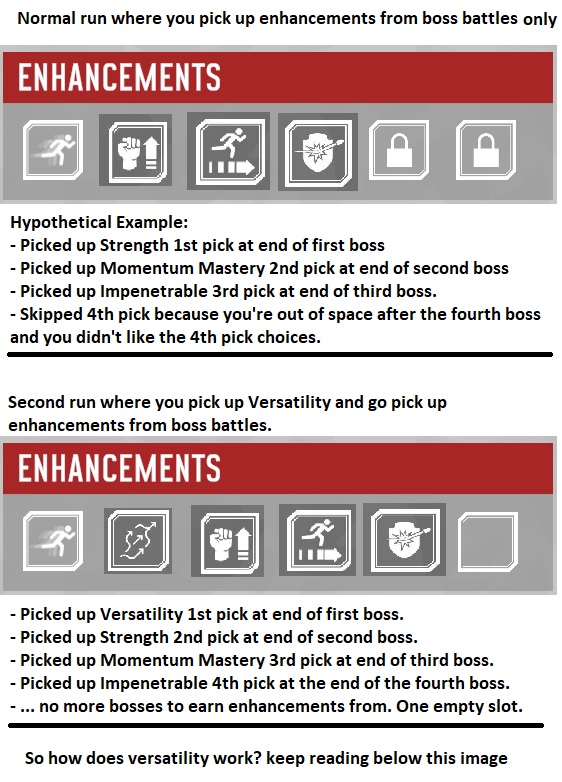 Well, there’s only one way to get more enhancements besides boss battles, and that’s the EVENT spaces on the overworld map. However, this is total RNG. There’s no guarantee that you will get an event that grants you a new enhancement. If you are lucky and get an event with such a reward, it usually is followed by a risk/reward where you might earn an injury instead. Finally, even if you strike lucky and get rewarded the enhancement… it might not be something useful that you want. And to enable all of this, you have to take Versatility which is now a dead slot until you manage to pick up something from an EVENT space.