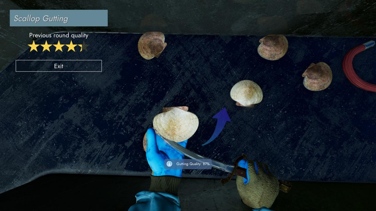 After cutting into the Scallop and receiving your star-rating, a blue arrow appears. Click at the bottom of the arrow and trace your mouse cursor through the centre to the end of the arrow. Keep a constant speed, not too fast. When you do this correctly, the Scallop will open. You have as many attempts at this as you like, with very little practice you can do it first time every time.