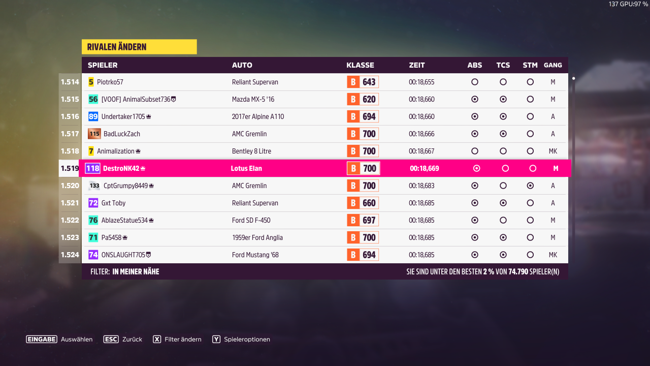 – also if the first drag race does not work up, try the second. The submitted leaderbords differ on both tracks and I did some on the first and some on the second. I did Tier D to A on the first Drag-track and Tier S1 to S2 on the second Drag-track