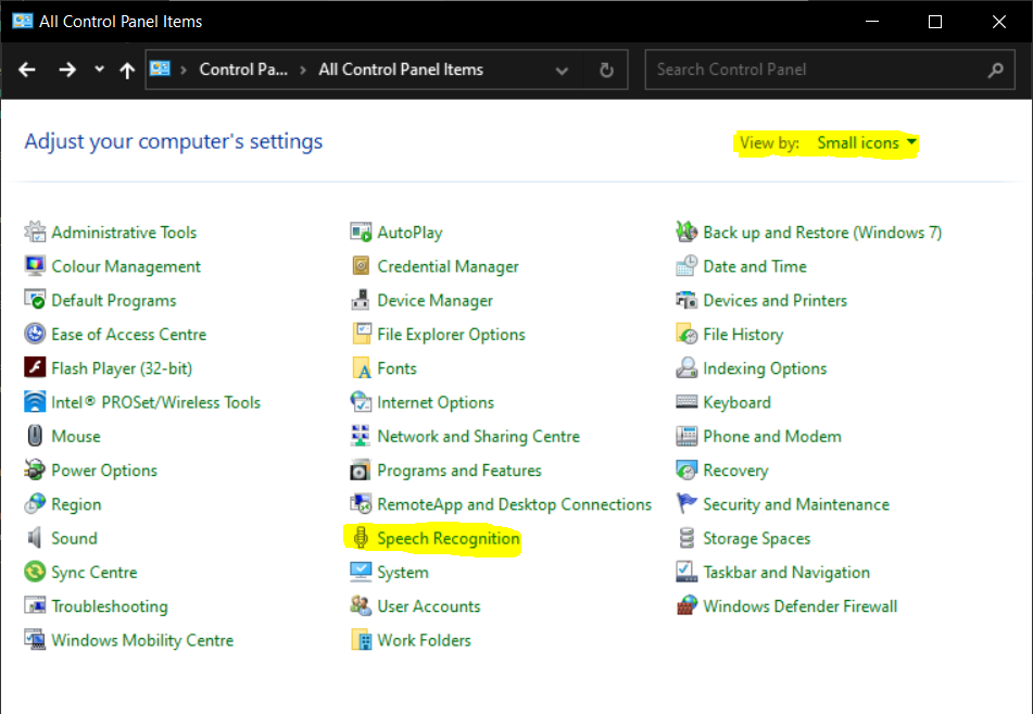 Once the Control Panel is open, make sure you have the ‘View by’ set to “Small icons”.