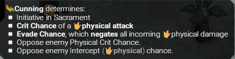 Basically, a Character’s Might statistic defines a Physical Fighter’s ability to reliably attack. Health defines their ability to reliably defend themselves and teammates against incoming Physical Attacks. Cunning defines their chance to attack or defend in a more fancy way – dealing critical damage or completely ignoring an enemy’s Physical attack.