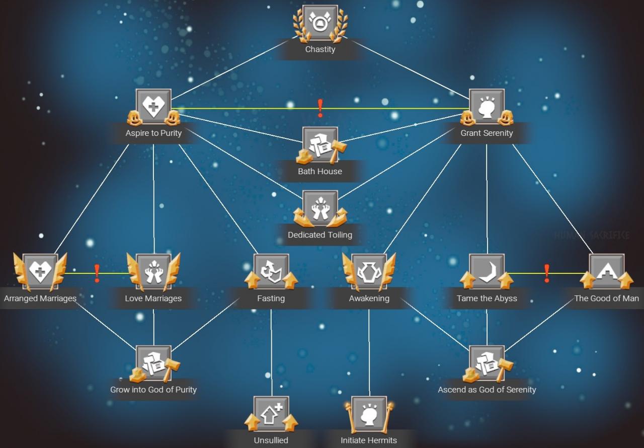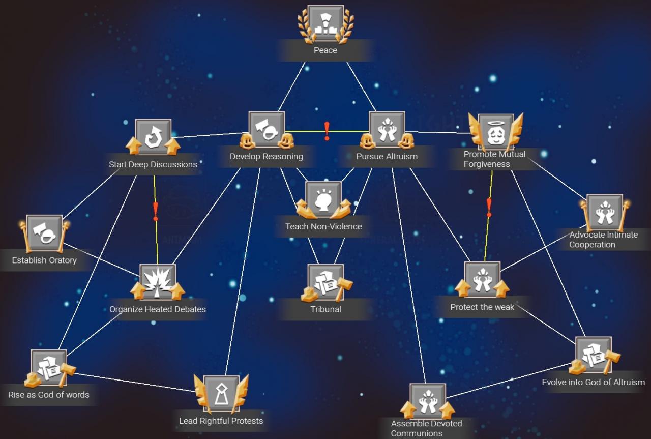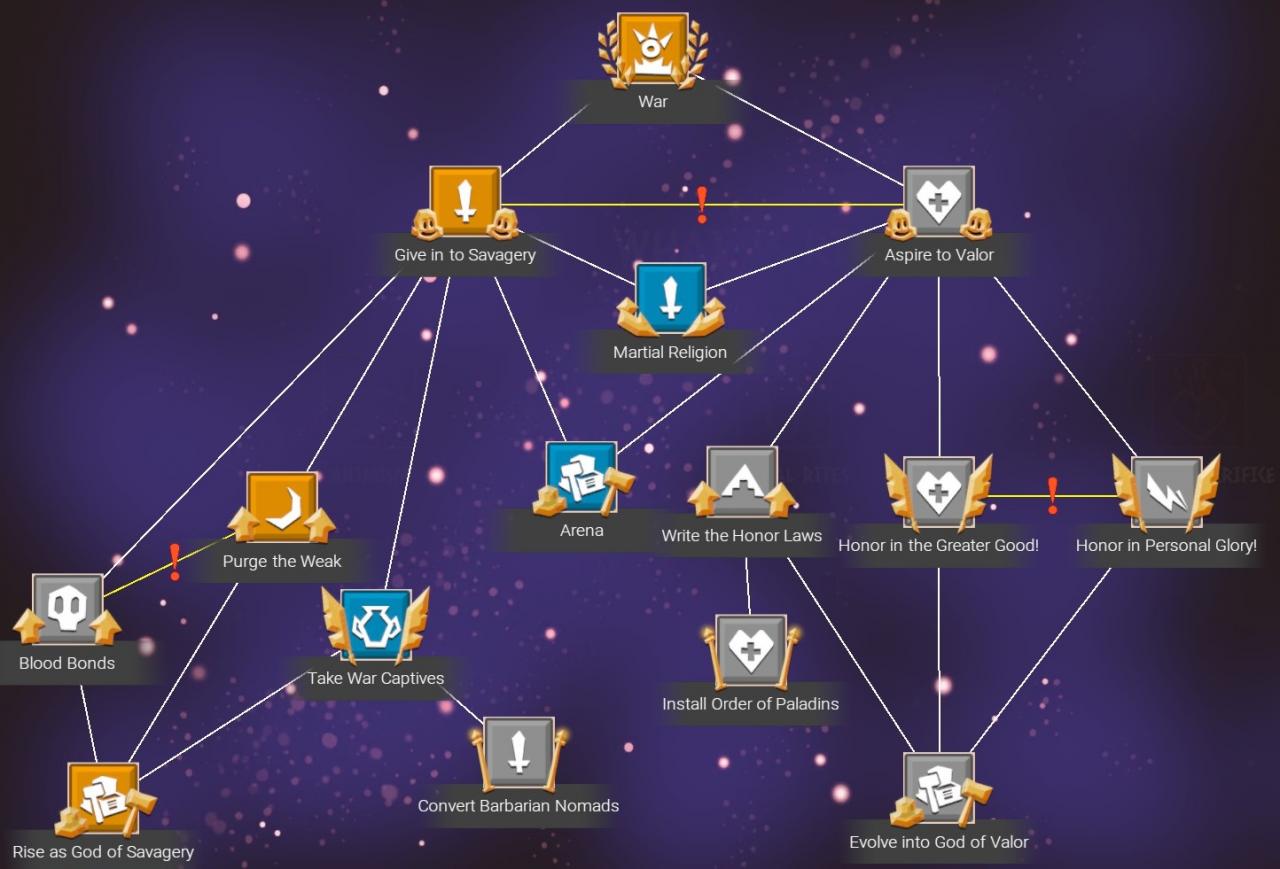 Developments are one of the primary methods to customize a religion. These can additional bonuses and attributes for your disciples. Progressing down the development tree allows you to unlock more powerful bonuses. Some developments are mutually exclusive meaning you can only pick one. These are identified by a red exclamation point in between two lines.