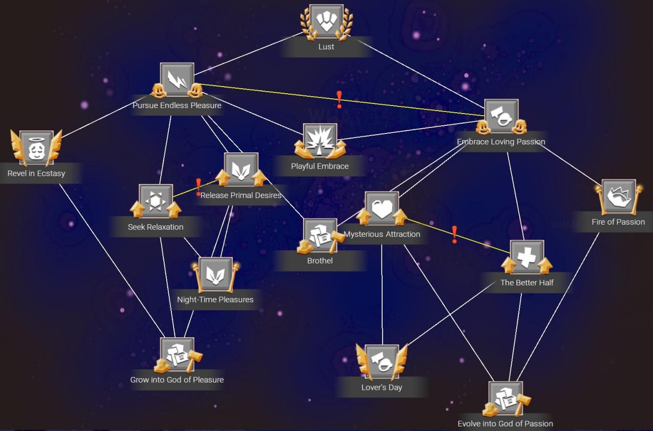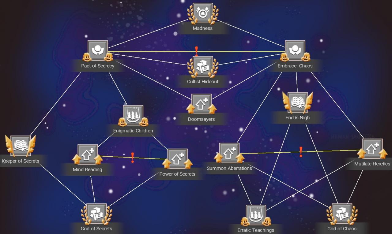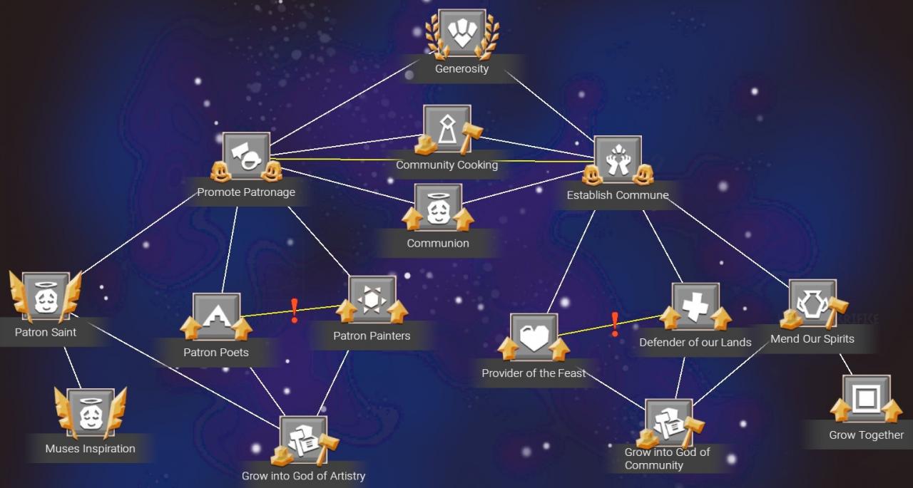 Developments are one of the primary methods to customize a religion. These can additional bonuses and attributes for your disciples. Progressing down the development tree allows you to unlock more powerful bonuses. Some developments are mutually exclusive meaning you can only pick one. These are identified by a red exclamation point in between two lines.