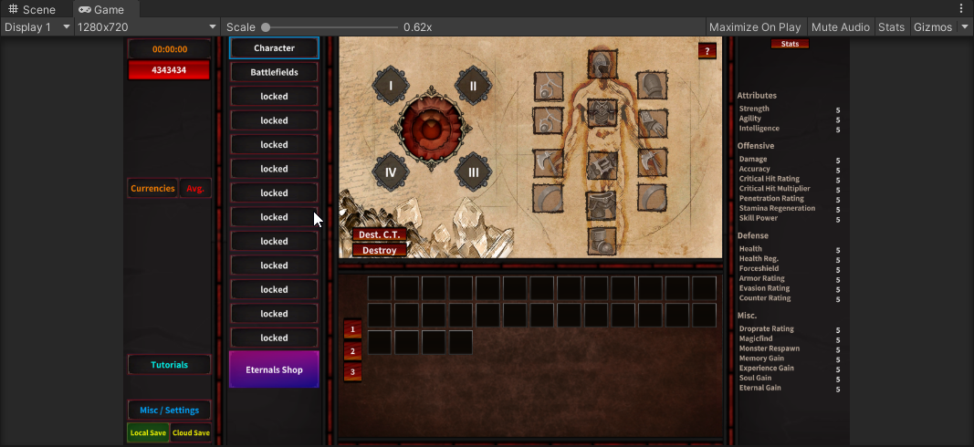 To the right is your STATISTICS BAR. This is where you find the final total of each of the main stats. You can hover over these stats for an explanation as to what they do.