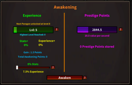 To the right, you will see the PRESTIGE POINTS section. You gain PP based on your current area and stage each second, and when the meter is full you gain additional PP upon awakening. This PP can be spent in the UPGRADES tab. The total unspent PP you have can be seen in the top right corner. Just below this is the timer for how long you’ve been in a run, and beside that is a toggle to reset your PARAGONS when you awaken.
