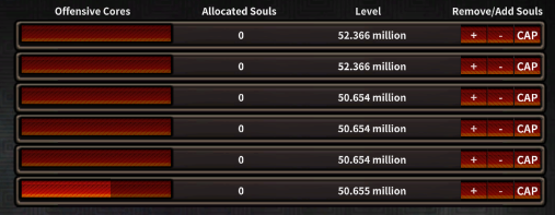 There are two types of Battlecores, OFFENSIVE and DEFENSIVE. Each of these has 6 different cores you can invest Soul into, with each one increasing the Soul required to cap it by a magnitude of 10. By investing Soul into any of these cores, you will increase the level of it by 1 every time the bar fills up.