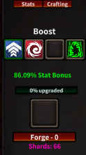 If you go back to the CHARACTER menu, and look to the right where the stats tab is, you’ll see another option there, CRAFTING. There are four sections, but only three of them are important right now. The first is where you use the BOOST CRAFTING RESOURCES gained by killing Nemesis. By dragging a piece of equipment into the box, you can FORGE it for a cost of shards, increasing all stats on it by 5% per forge, up to 100%, pretty simple. By forging an item up to 100%, you gain a small bonus to all stats.