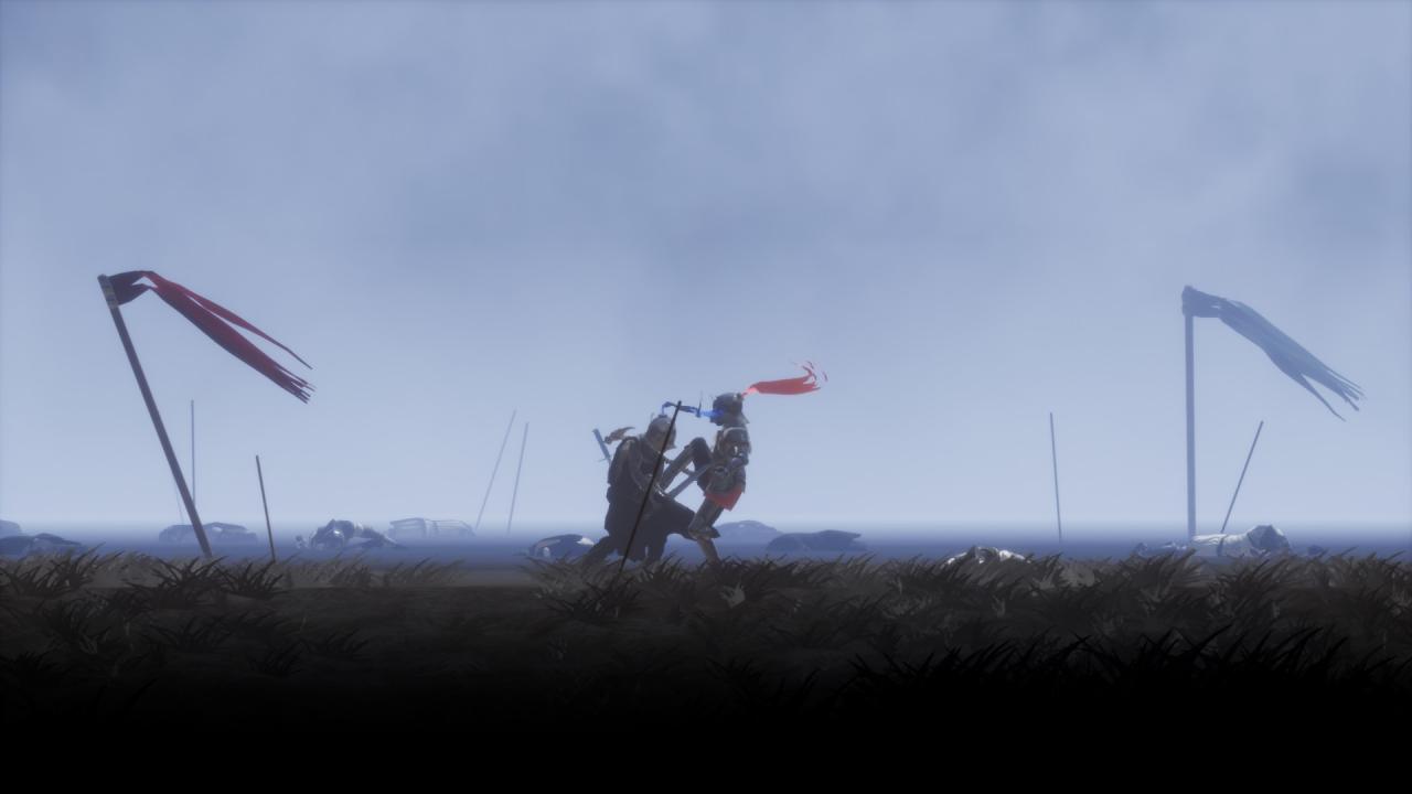 Kicking is initiated when pressing the shove key while in the “downwards” stance. Kicking functions the same way a shove does, stunning the enemy and pushing them back. However, kicking does have a slightly longer range, but a significantly longer windup time. If shoved while in the process of delivering a kick, your knight will get knocked to the ground, leaving you vulnerable to attack.