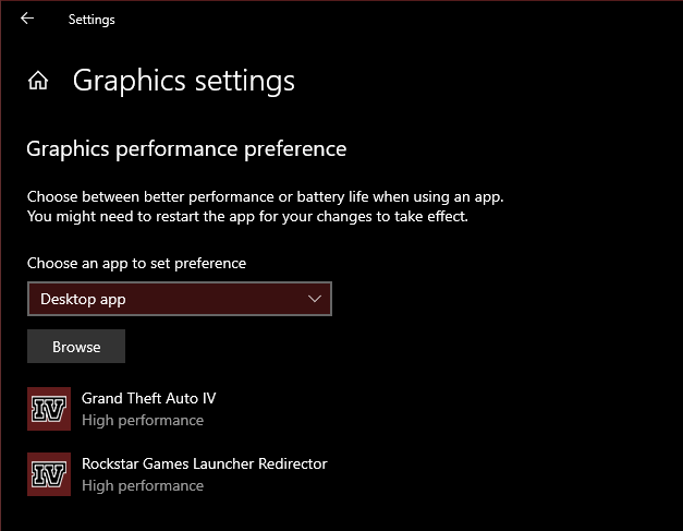 search graphics settings and select Desktop App and browse to find the folder we added commandline.txt. Here you should add the GTAIV.exe and the launcher exe (I had best results when adding both). You may also need to do the same in you GPU control panel.