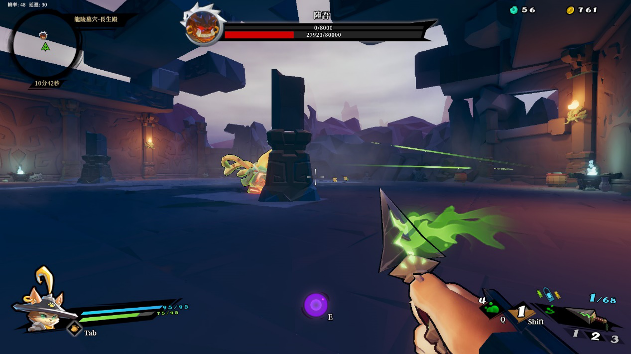 Lu Wu will be more aggressive when its HP falls to certain degree. It will frequently use laser cannon, leap attack, stone and so on. If you don’t have the Occult Scroll which can reduce the cooldown time of dash, you’d better go around the pillar to evade its attack.