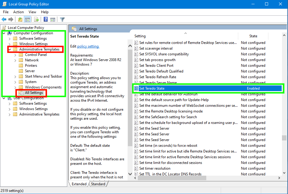 Now you should have Local Group Policy Editor opened up, under Computer Configuration expand Administrative Templates and find the folder named All Settings (should be the last one) click on it and there should be a very long list on the right side, find Set Teredo State , and double click