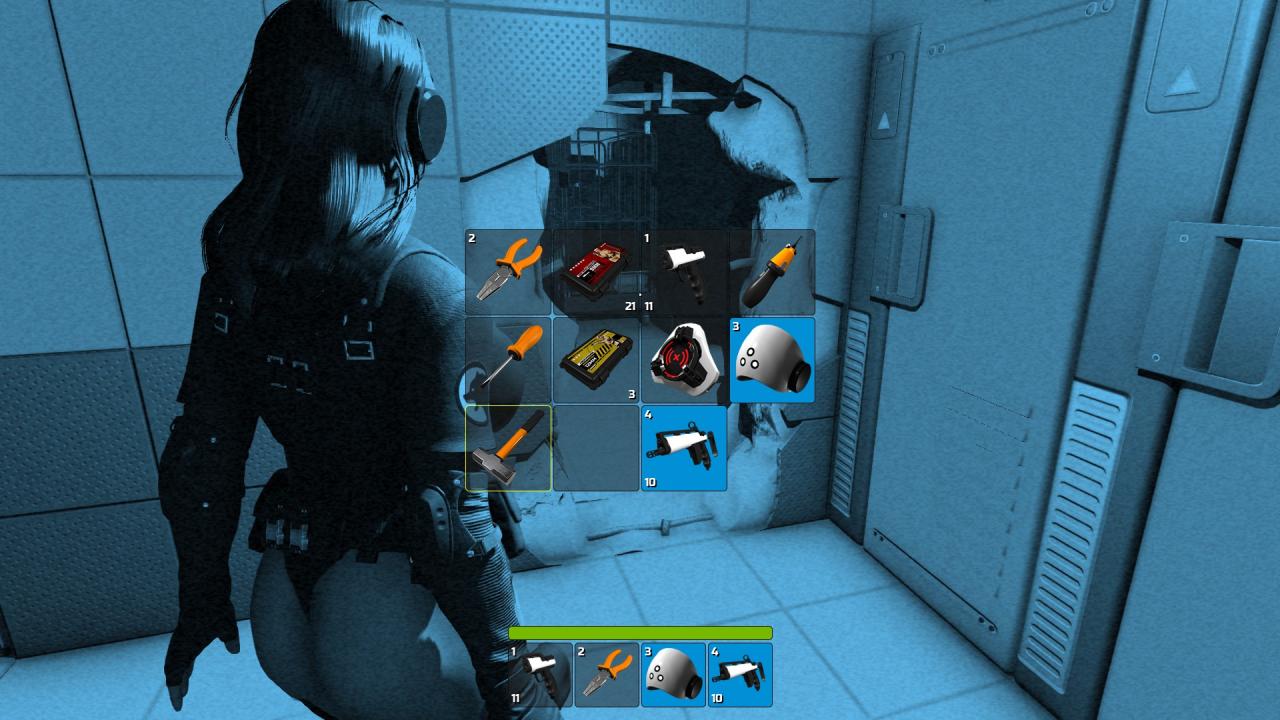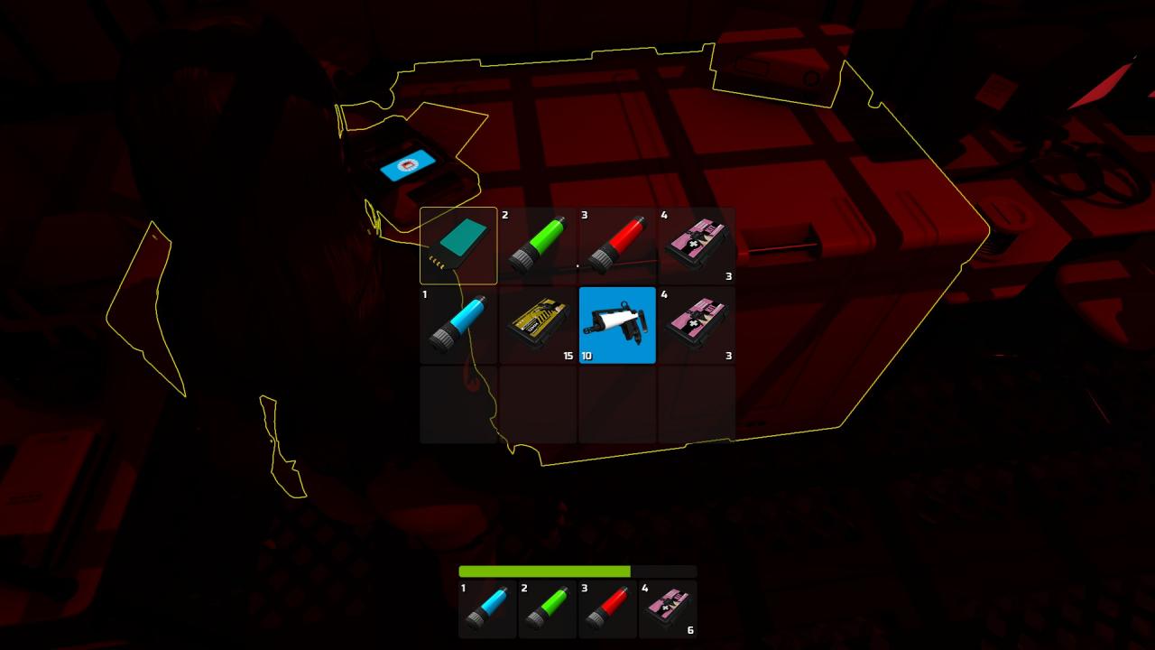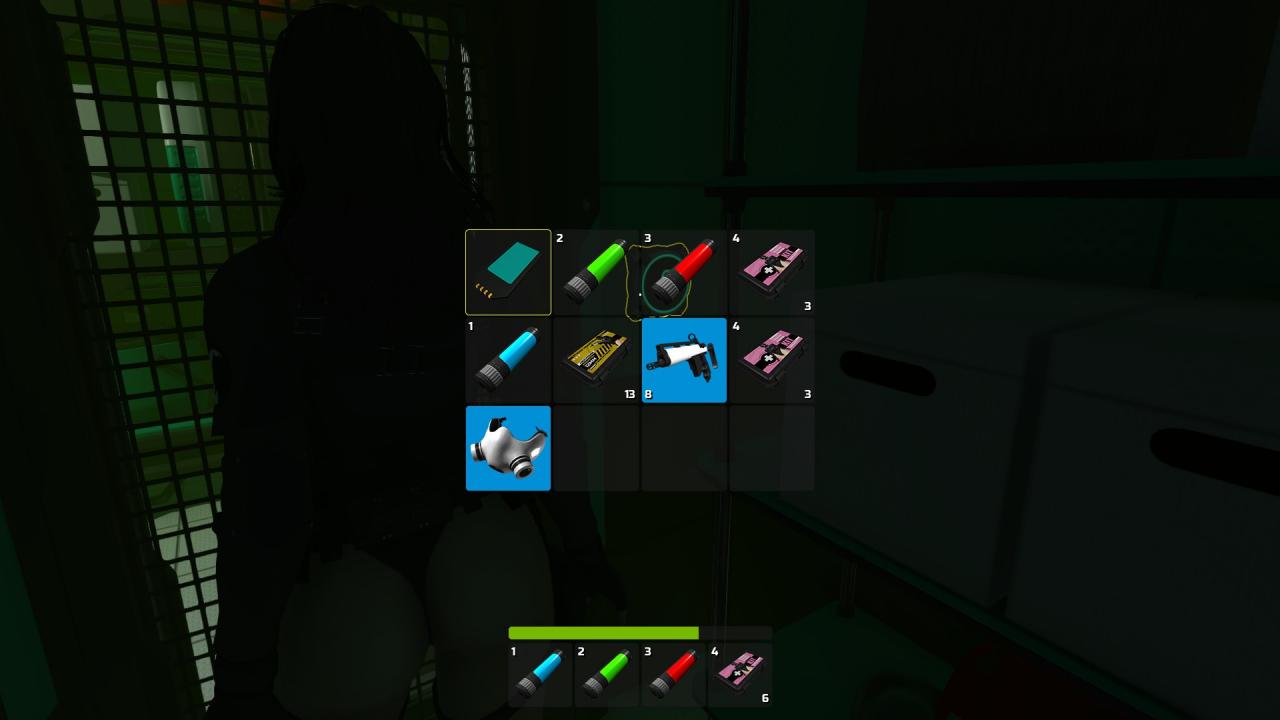 Now here is what you need to do, put everything you can inside your box and take light blue key card, blue liquid on key 1, green liquid on key 2, red liquid on key 3,  (you can place it in whatever order you want actually), medkit 6 key 4 (if you have more pick up, since with only 6 you are going to end up using all of them) and equip you rifle/shotgun. now open the menu and place you mouse on the same spot here the light blue key card, because as long you don’t open the menu the mouse won’t move this is useful to us.