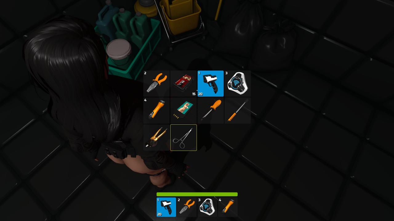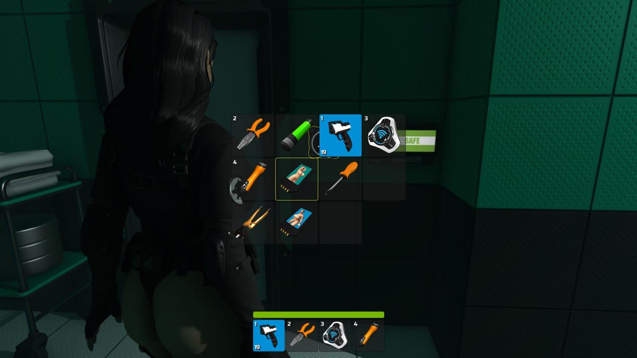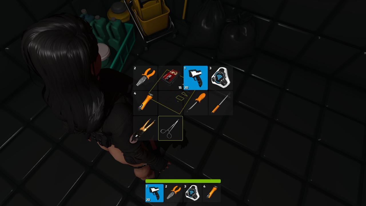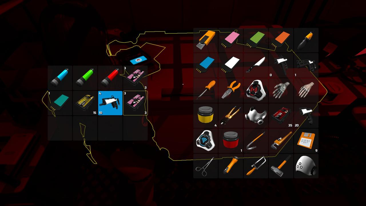 Now here is what you need to do, put everything you can inside your box and take light blue key card, blue liquid on key 1, green liquid on key 2, red liquid on key 3,  (you can place it in whatever order you want actually), medkit 6 key 4 (if you have more pick up, since with only 6 you are going to end up using all of them) and equip you rifle/shotgun. now open the menu and place you mouse on the same spot here the light blue key card, because as long you don’t open the menu the mouse won’t move this is useful to us.