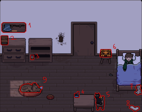 Sublocations: Lore’s Room, Hallway, Living Room, Kitchen, Outside, The Forest