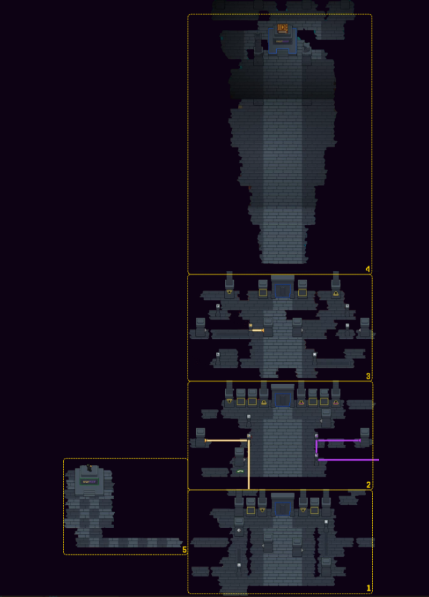 The Save Room is nearly identical to Lore’s Room (the first room in the game), but it is distinct in that it acts as a “one-way hub”, as Lore will enter this room upon selecting Continue, dying, or resetting at a ledger. The door leads to the last used ledger.