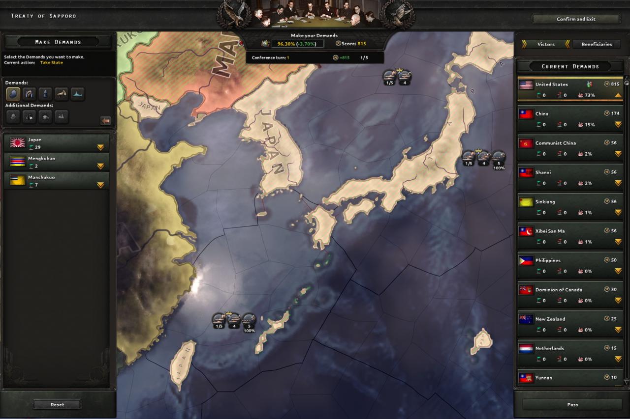 - Right panel – Current Demands panel, listing un-submitted and submitted demands by each victor country listed on the right. Un-submitted demands may be deselected from this panel.