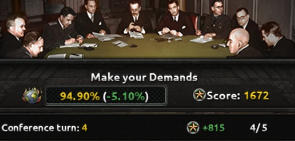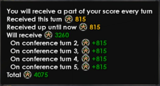 When there are multiple victors in the conference, every victor’s war score will be issued in 20% increments over five turns. Thus, in the above example, Germany will be awarded 1039.5 * 0.2 = 208 war score per turn.