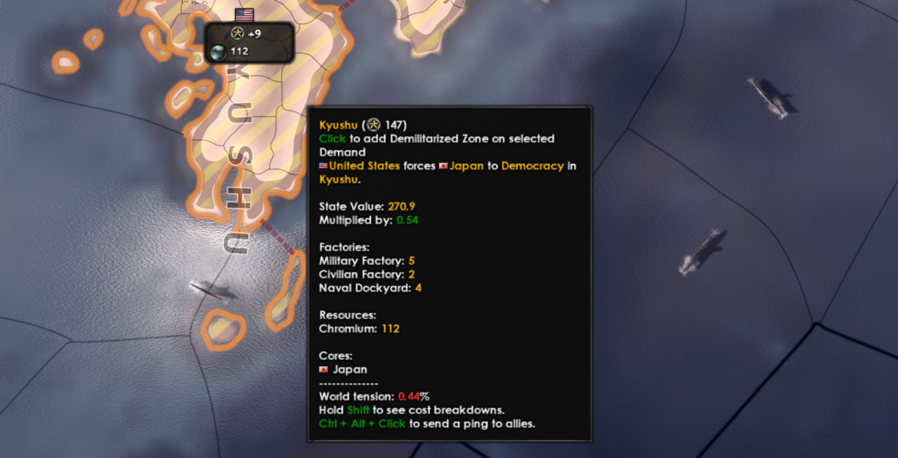 Hovering over each demand displays a tool tip with more details of the demand, including its costs, beneficiary country, puppet type that will be created, other countries contesting, world tension effects, etc. This tool tip also displays in the map when hovering over the associated state, as shown below.