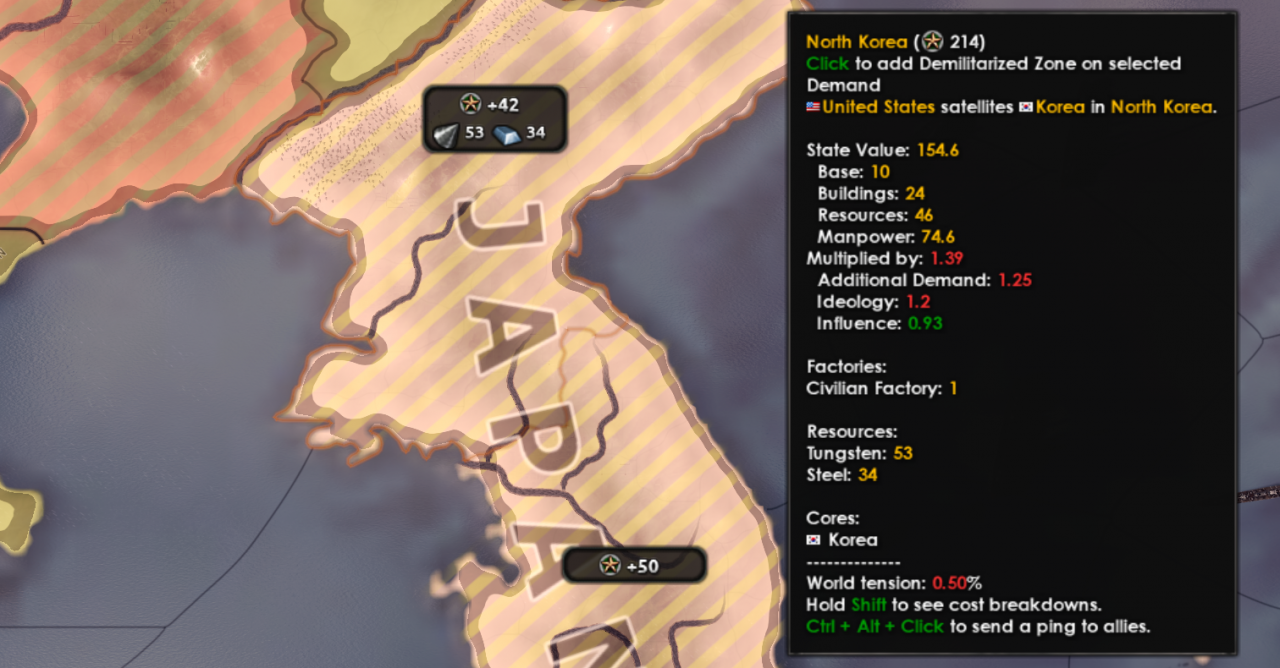 - Additional demands – Adding demands such as Add DMZ or Add Resource Rights on top of puppeting a state or changing its government will add to its cost by about 25% for each additional demand. Note that Resource Rights will be 25% of the puppeting costs regardless of how many resources are available in the state.