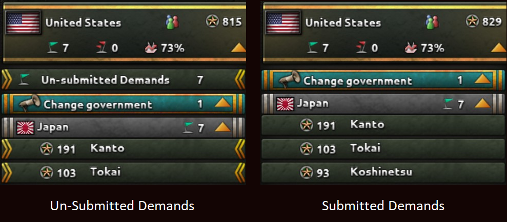 Prior to end of turn, un-submitted demands are bracketed with yellow chevrons. An Un-Submitted Demands slot appears in the list of current demands and clicking on it opens a summary of the pending demands. After the turn, if the demands go uncontested, the chevrons are removed and the Un-Submitted Demands slot disappears.
