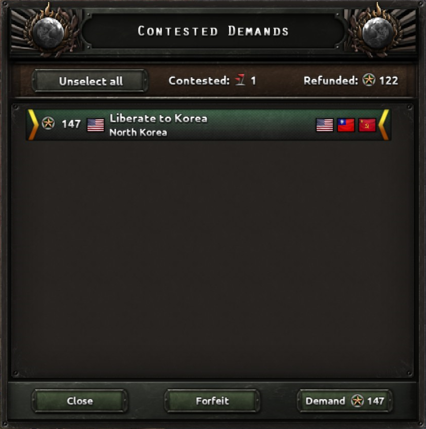 Demands submitted by you and one or more other victors are considered contested and the associated war score points are temporarily refunded to you. The Contested Demands window displays, presenting you with a decision: