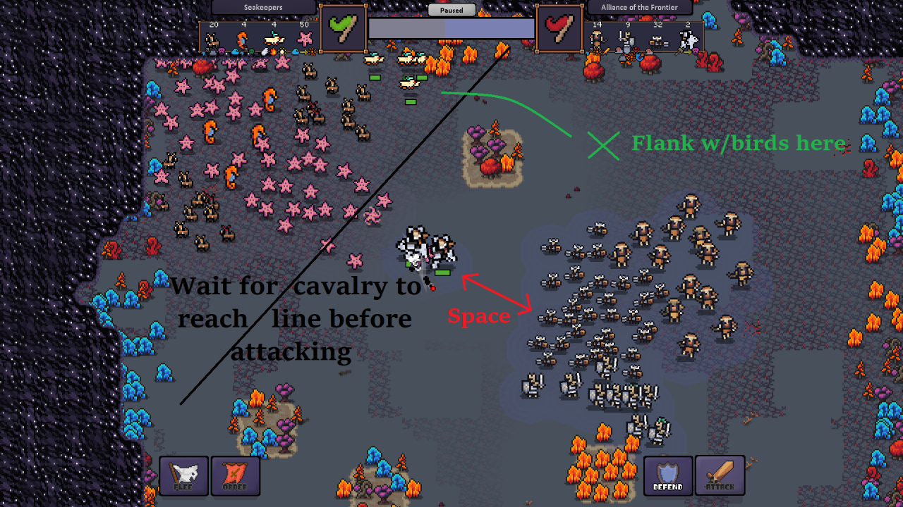 The timing on this is a little tricky, because it coincides with the timing of changing your army to attack mode. Again: the less obstacles on the map, the better. Since flamebirds have resurrection and dodge, you want them to flank the deadeyes before they start shooting your seastars. This gives the seastars time to swarm/destroy the cavalry and hillkeepers.