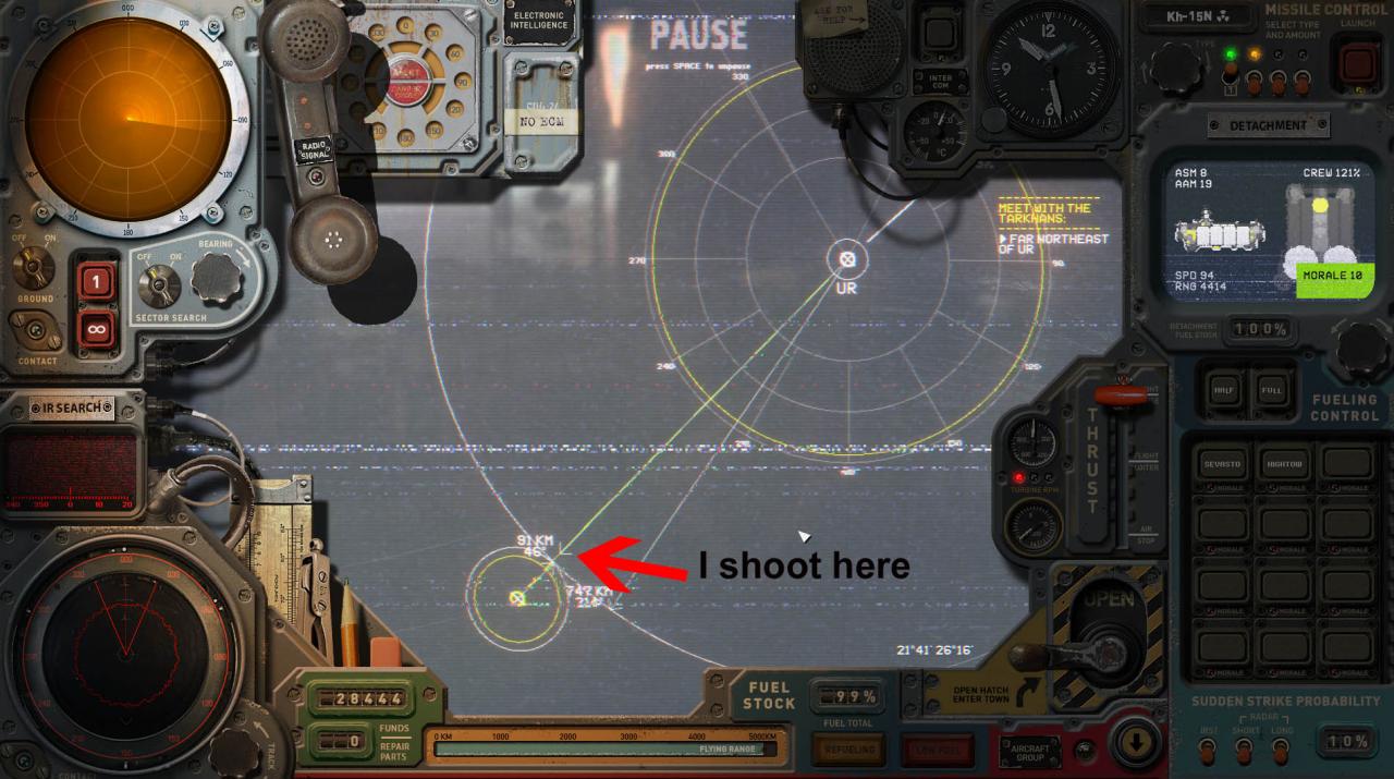 5. Click on the map within the range of the thick white max range circle (it goes red if you are targeting too far) OR click on a red diamond that’s within the yellow circle of a fleet to attempt a SARH guided shot if missile is able (See missile guidance section for more information)