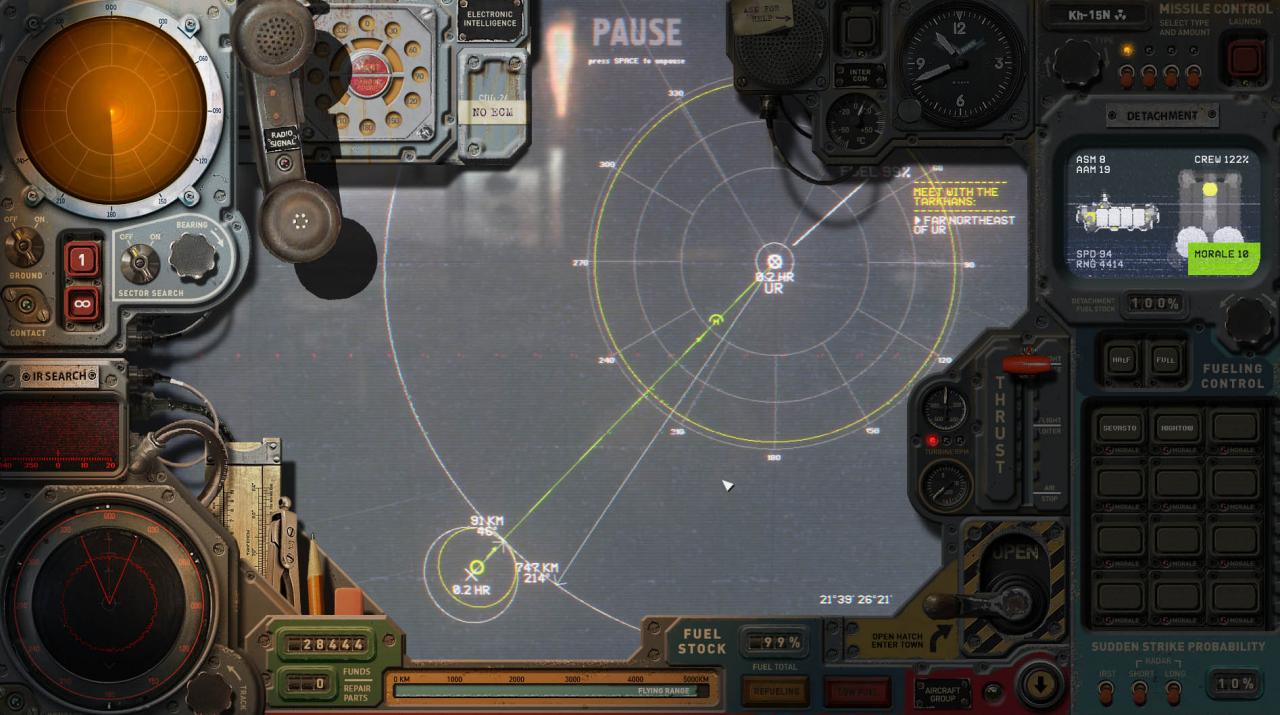 If you click on the red diamond target within the yellow circle of any of your fleets, the missile will use SARH guidance. This means it will guide to target using a fleet’s sensors as soon as you launch it and continue to track as long as the enemy fleet is within the range of one of your fleet’s yellow circles. A red line going from missile to the target indicates a good lock and track.