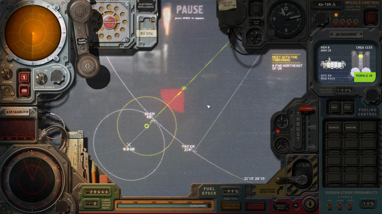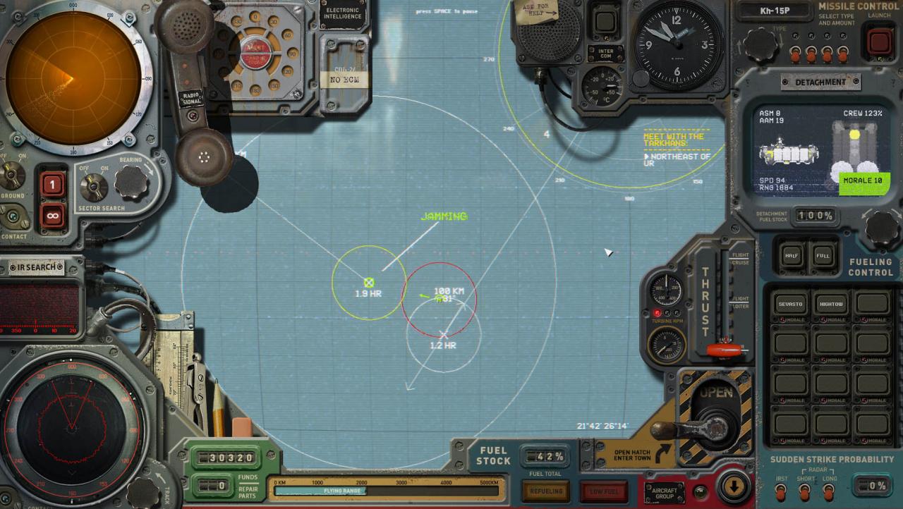 While the missile is flying to a target point on the map and no red lines, cones, or circles are drawn from it, then the missile is in ballistic flight (flying in a straight line) with sensors off. In this flight mode the missile is completely dumb and vulnerable to anti missile attack. In the missile attack engagement, you will see the missile fly past at the top of the screen when it’s ballistic with sensors off.