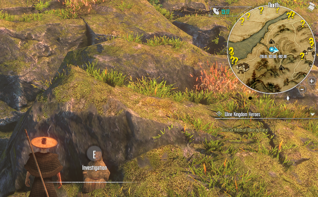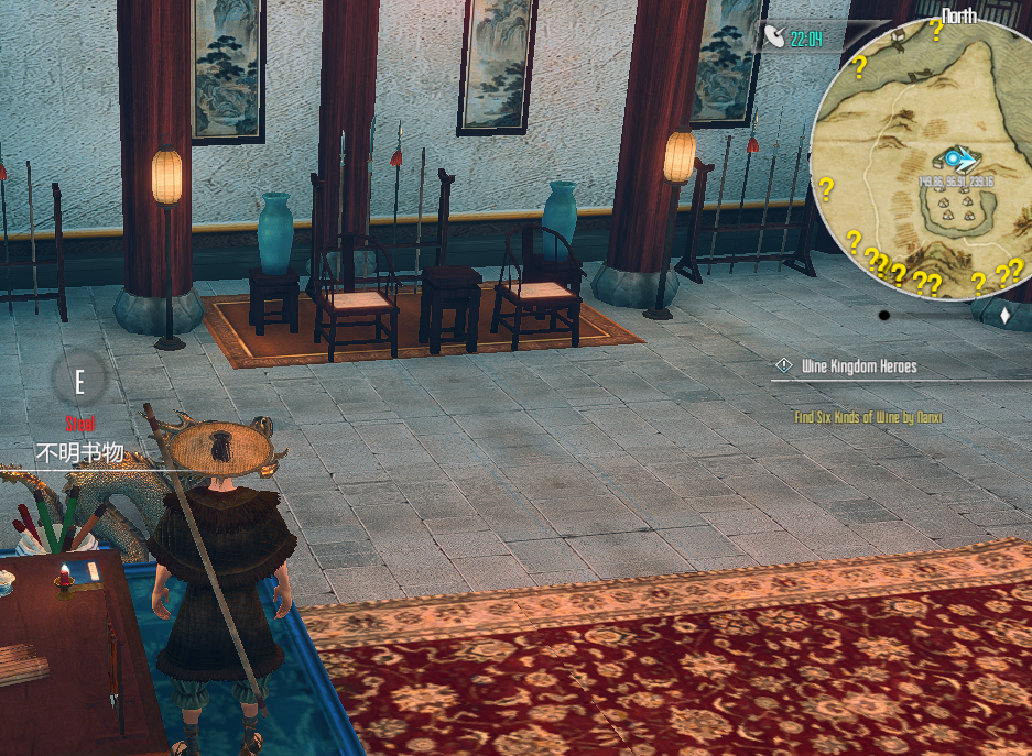 (Quiet, Soft). Use a jade coin on a statue. Both halves of the coin can be found east of Gongshi Village. One by giving some booze to some workers (given to you in a bag), another by fighting some thieves that raided a cart. Assemble the coin by clicking on each half. Statue is below.
