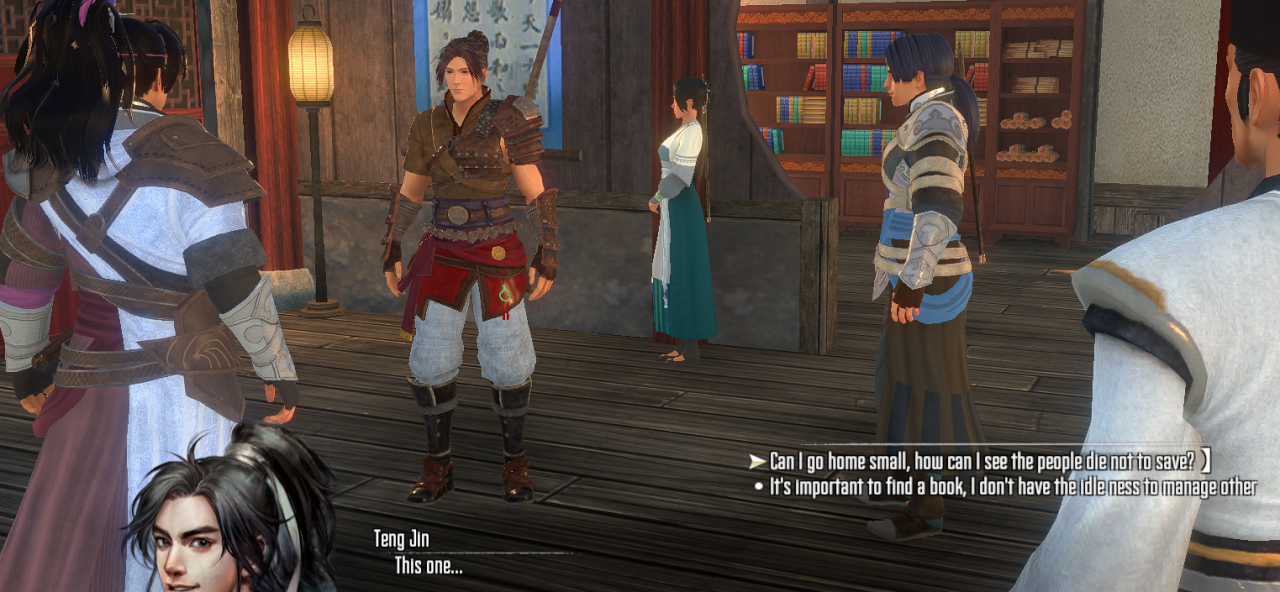 Get captured when speaking to the woman at the Black Shop west of Shijia Village. Book is in the jail cell.