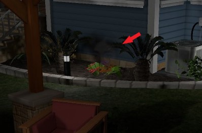 Move to the Yard camera. In the background in the middle of the screen are flowers between two other bigger plants. The woman’s transparent image is over those flowers, harder to see this time.