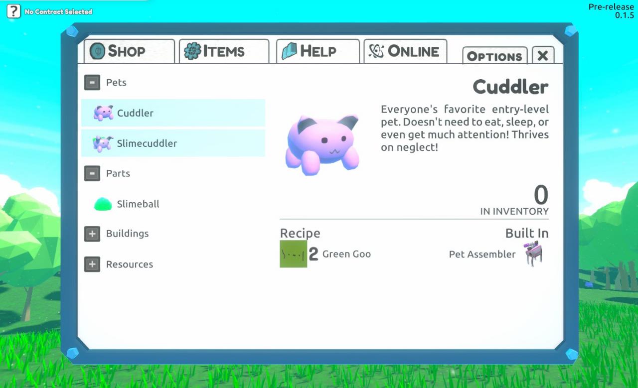 Every time you complete a contract, you receive one of that item, so you’re now the proud owner of a Pet Assembler! You can now create your own Cuddlers without needing to hunt them down in the wild! Go ahead and select the fence recipe from the store, you’ll need these next!