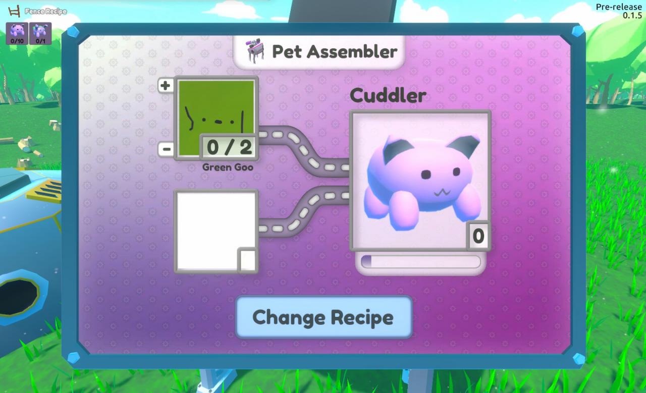 Select the Pet Assembler recipe. We’ll need at least 4 Cuddlers to unlock your first blueprint: The Pet Assembler! This machine is the basis for all pet creation!