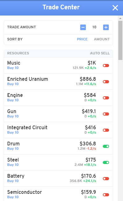 As you can see from this example Trade Center, there’s a lot of information being shown to you. On the left is the name of the Resource, and an option to buy them from the Market. On the right, the large number in black is the current Market Price per unit of the resource, below it in grey is the number you currently have in your stockpiles, and then the number in red or green is the deficit or surplus per second of that good in your supply chain. The switch to the far right is to activate or de-activate autoselling of that resource.