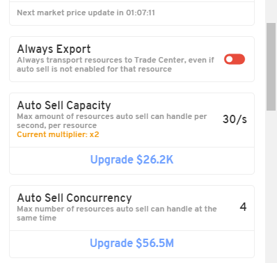 You have two upgradeable mechanics in the Trade Center, Auto Sell Capacity and Auto Sell Concurrency. Auto Sell Capacity sets the limit of how many of each object per second the Trade Center can sell. It will always sell the maximum number if they are available, so be careful about upgrading this too high too early in the run. If it’s selling 40 or 50 a second of a resource and you can’t produce enough surplus to meet the demand, you’ll slowly drain your stockpile unless you just stop selling that resource.