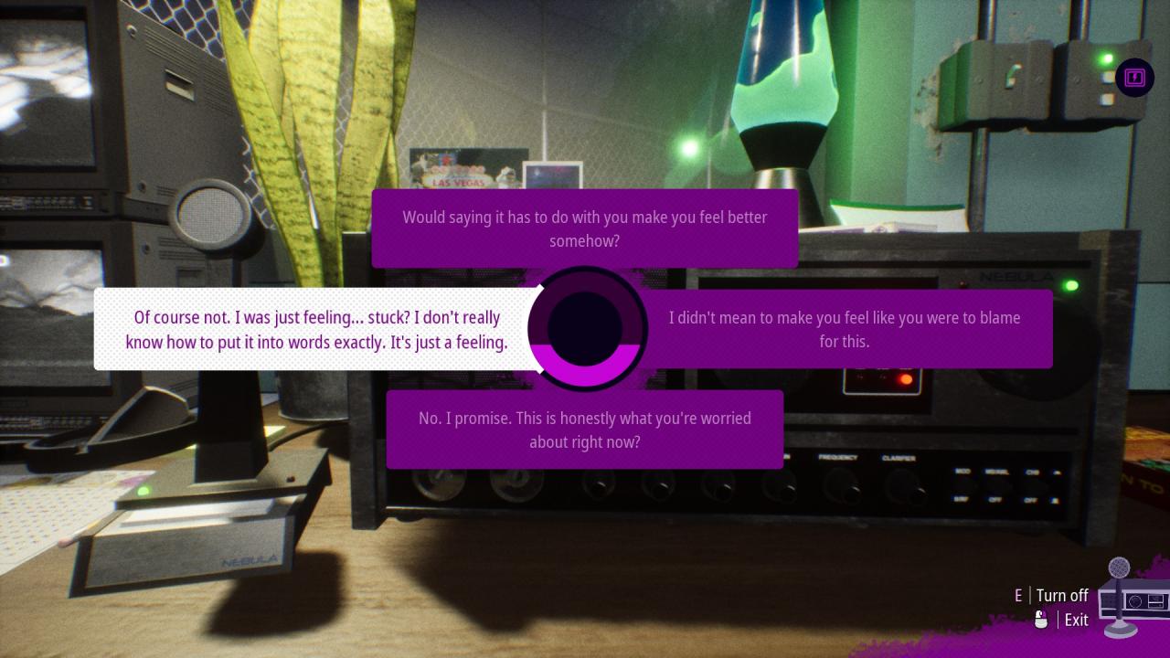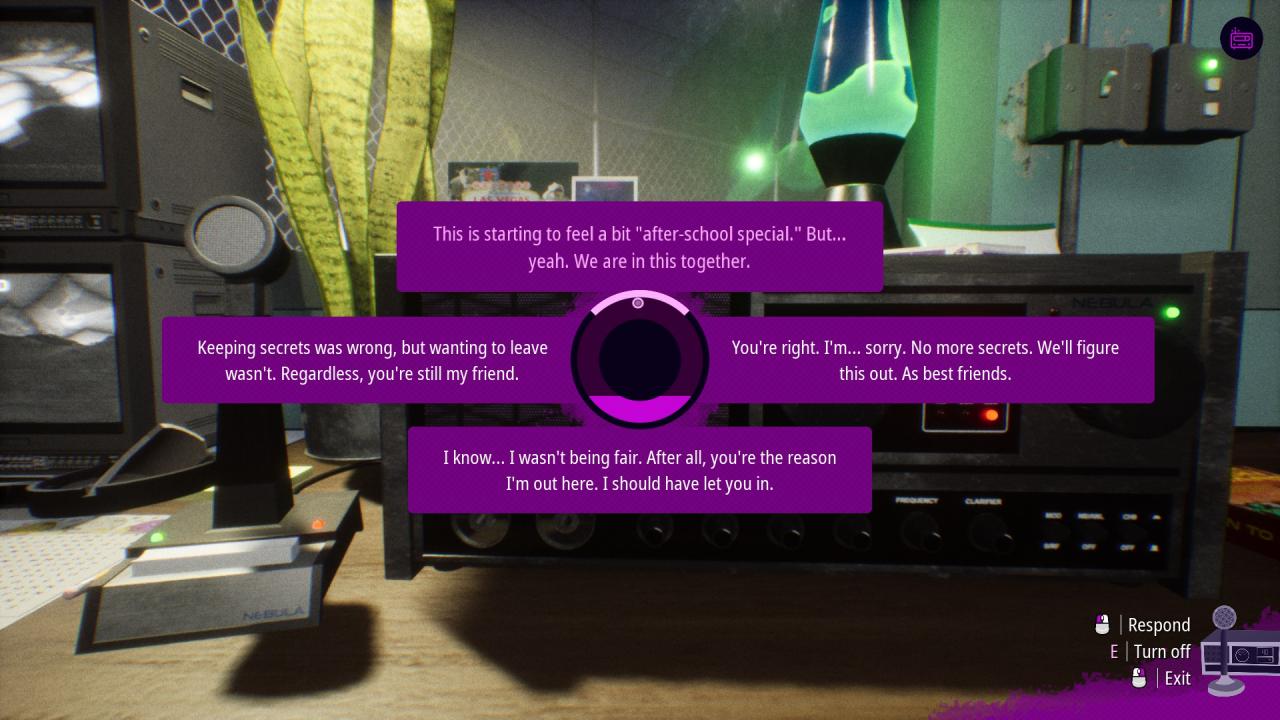 For this achievement all you have to do is when she starts doubting you during this damn crisis is to literally try to tell her your “feelings” and by that I mean being nice to her and NOT blame her of be sarcastic during this very “serious” conversation. If you succeed in this the DJ will play a song about friendship and you’ll have unlocked this achievement! Here are some dialogue choices that got me this achievement.