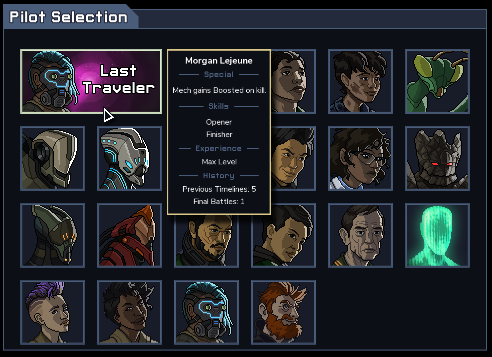 "Pilot_Original") Experienced: Gain +2 bonus XP per kill. (Ralph Karlsson) "Pilot_Repairman") Frenzied Repair: Push adjacent tiles when repairing. (Harold Schmidt) "Pilot_Assassin") Armored: Mech gains Armored. (Abe Isamu) "Pilot_Genius") Starting Shield: Mech starts every mission with a Shield. (Bethany Jones) "Pilot_Hotshot") Maneuverable: Mech can move through enemy units. (Henry Kwan) "Pilot_Warrior") Preemptive Strike: Deploy anywhere on the map, damaging adjacent enemies. (1 power required) (Gana) "Pilot_Recycler") Flying: Mech gains Flying (1 power required) (Prospero) "Pilot_Youth") Impulsive: Gain +3 Move on first turn of every mission. (Lily Reed) "Pilot_Leader") Sidestep: After attacking, gain 1 free tile movement. (Chen Rong) "Pilot_Soldier") Evasion: Mech unaffected by Webbing and Smoke. (Camila Vera) "Pilot_Medic") Temporal Reset: Gain 1 extra 'Reset Turn' every battle. (Isaac Jones) "Pilot_Miner") Double Shot: Mech can act twice if it does not move. (2 power required) (Silica) "Pilot_Aquatic") Fire-and-Forget: Move again after shooting. (1 power required) (Archimedes) "Pilot_Mantis") Mantis: 2 damage melee attack replaces Repair. (Kazaaakpleth) "Pilot_Zoltan") Zoltan: +1 Reactor Core. Reduce Mech HP to 1. Gain Shield every turn. (Mafan) "Pilot_Rock") Rockman: +3 Health and immune to Fire. (Ariadne) "Pilot_Arrogant") Arrogant Boost: Mech is Boosted if full health, otherwise -1 Move. (Kai Miller) "Pilot_Caretaker") Reassuring Hand: After Move, Repair adjacent Mechs. (Rosie Rivets) "Pilot_Chemical") Field Research: Mech gains Boosted on kill. (Morgan Lejeune) "Pilot_Delusional") Chosen One: On Reset Turn, gain Shield and +2 Move. (Adam)