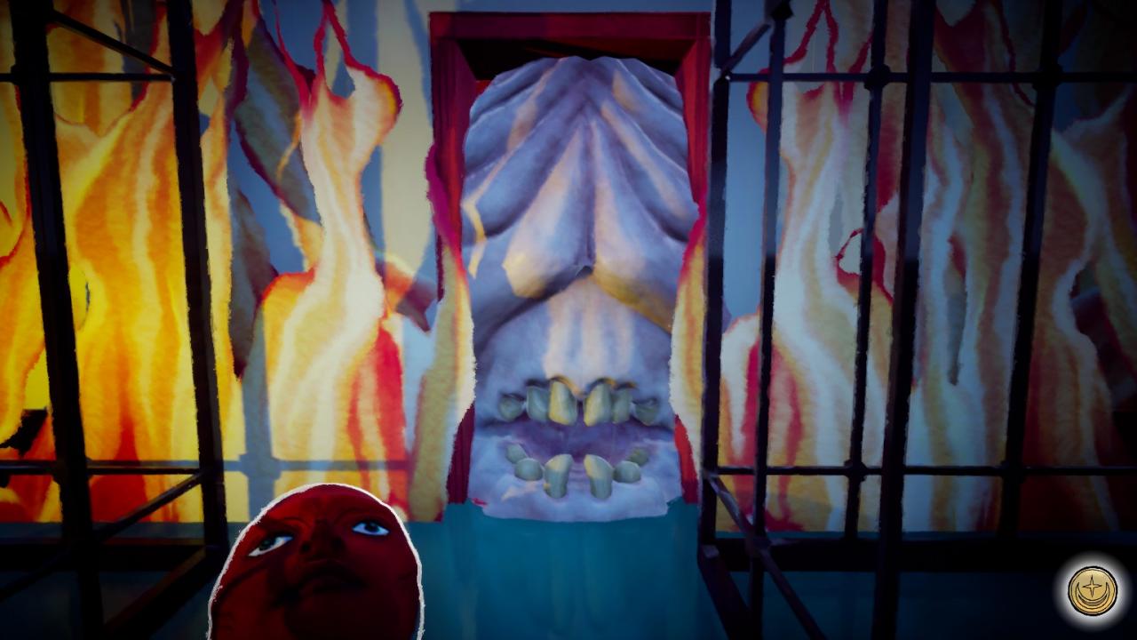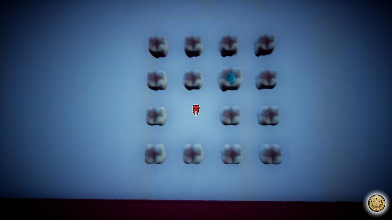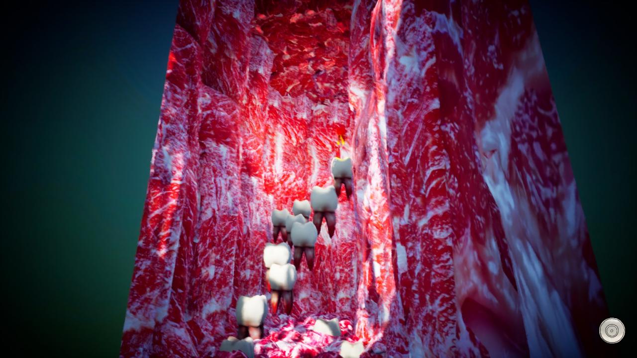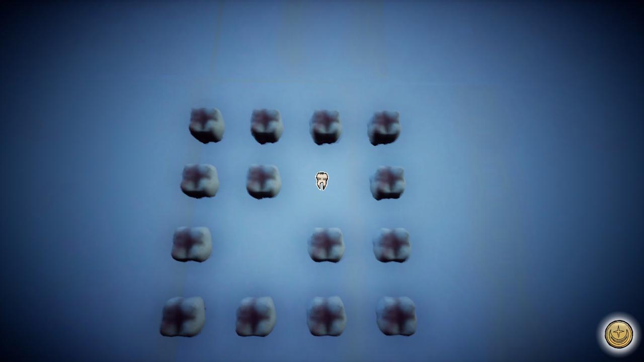 - Use one of the teeth from the floor, throw it (with Right Click) at the glowing one located on the ceiling. Pick up the [TOOTH]. Place it on the wall, next to the other teeth.