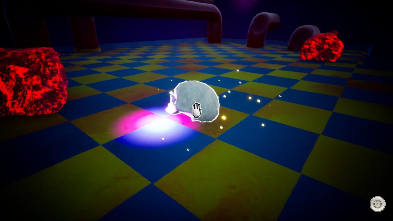 - Take an object from the ground and throw it at the skull. It will run away. Follow it and hit it each time with an object from the ground. It will fall on the ground. Pick up the [SKULL].