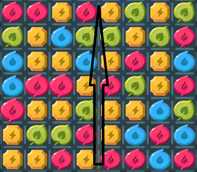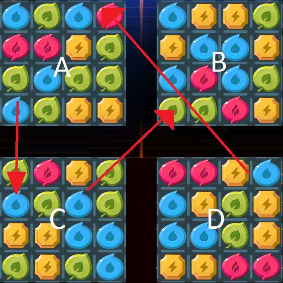 The Boss starts with 72000 HP. Your field is split into two 4×9 Grids (Pic 1) going top to bottom, with the left grid feeding the right (Pic 2). Basically imagine that the left grid is stacked on top of the right grid for one long 4×18 grid. But you cannot make matches across the two grids, nor manually move stones between the two.