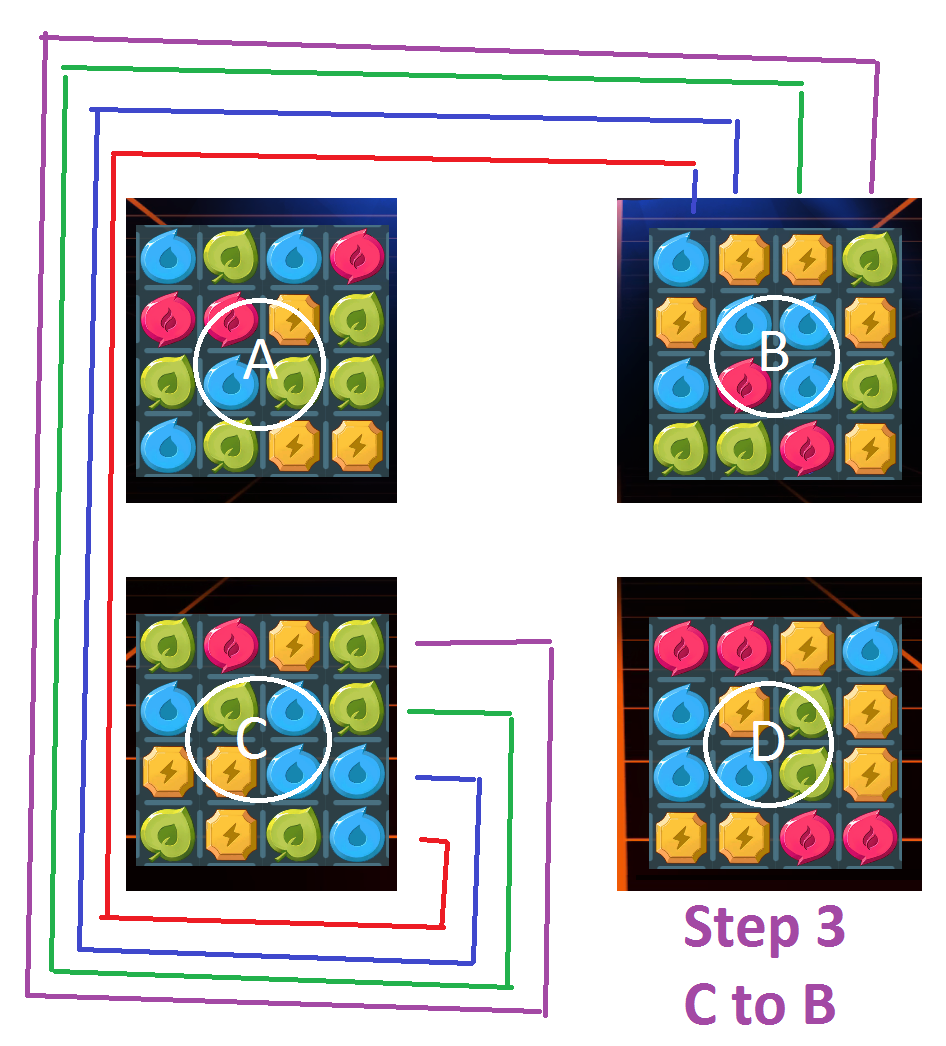 Sixth, do most of your work in mini Grid D. That pulls along all of the other stones from the other three mini Grids, and gives you a lot more matches.