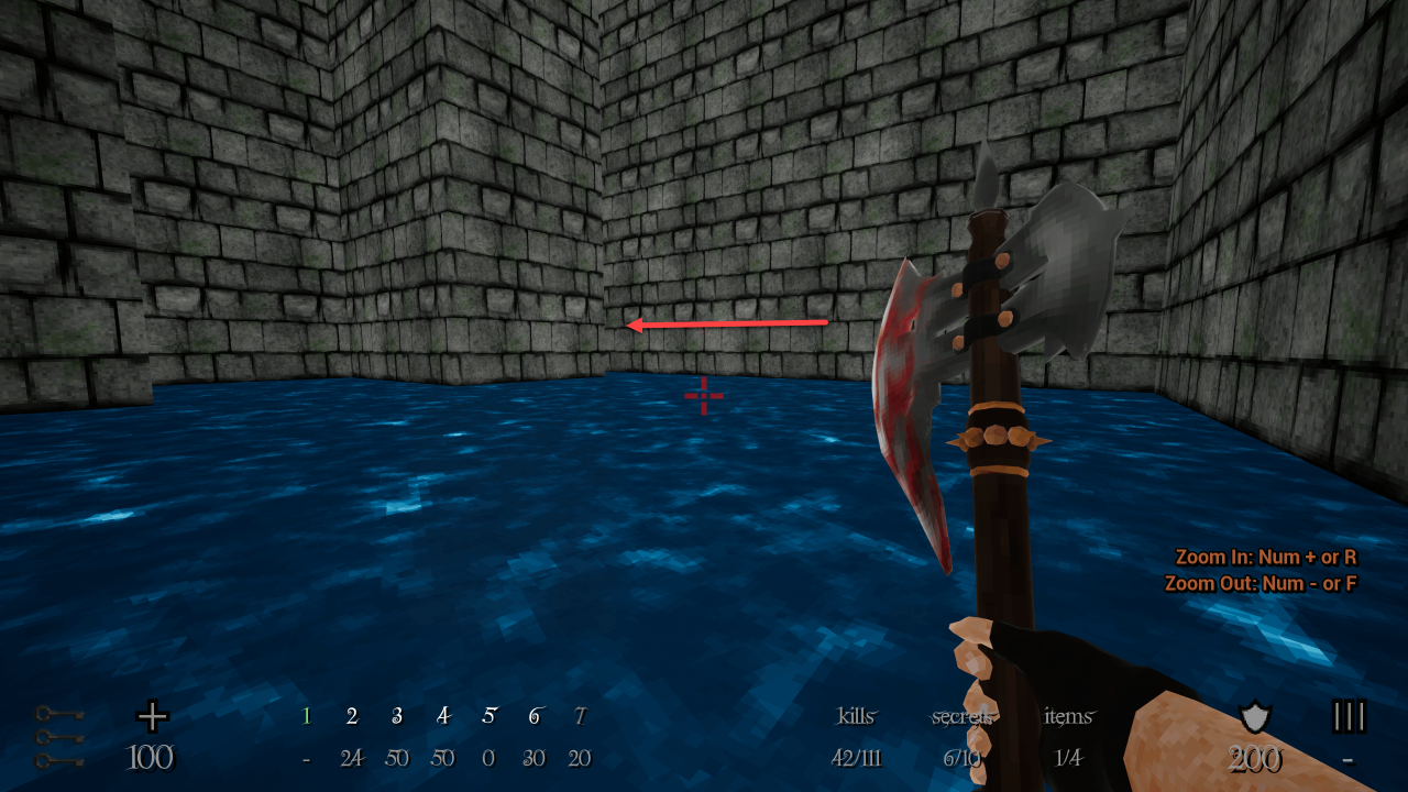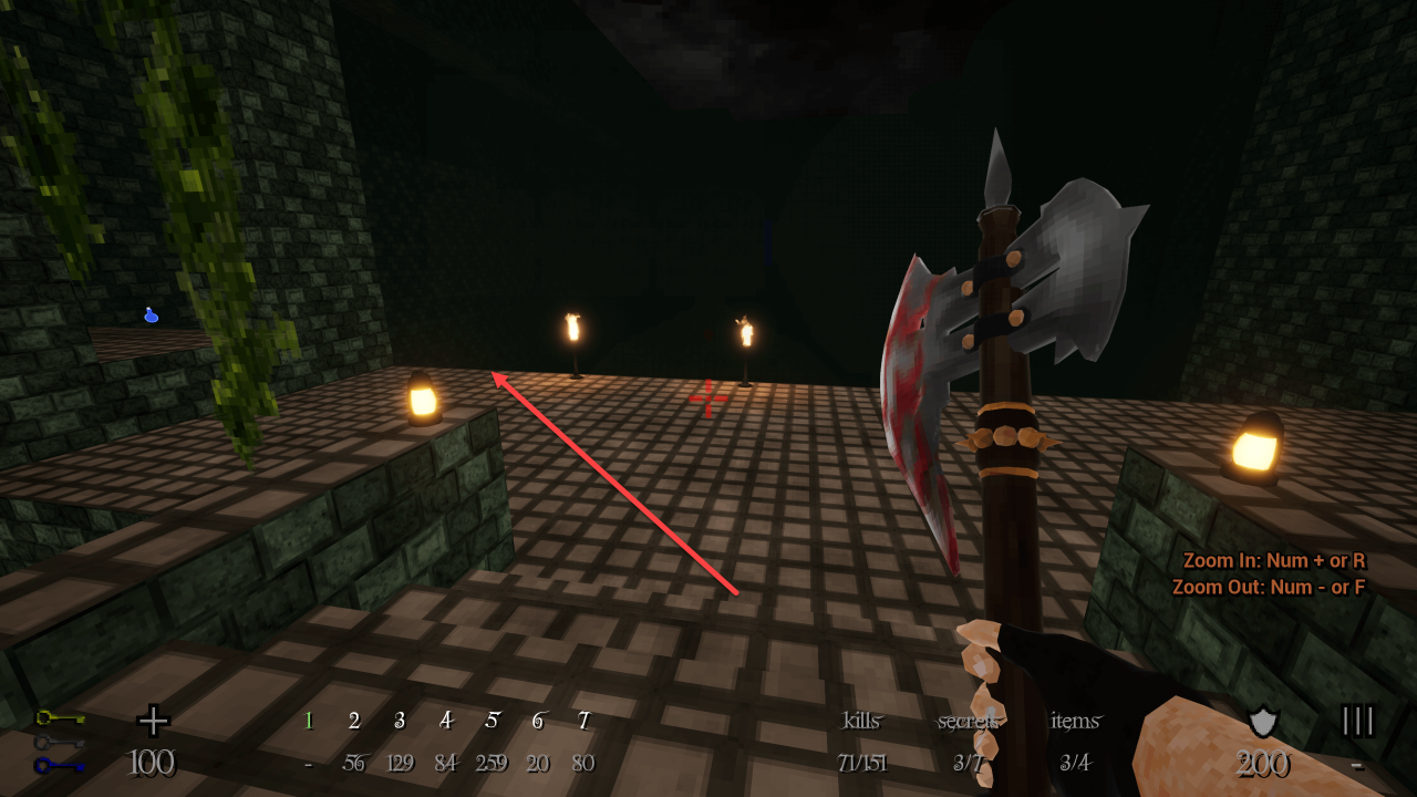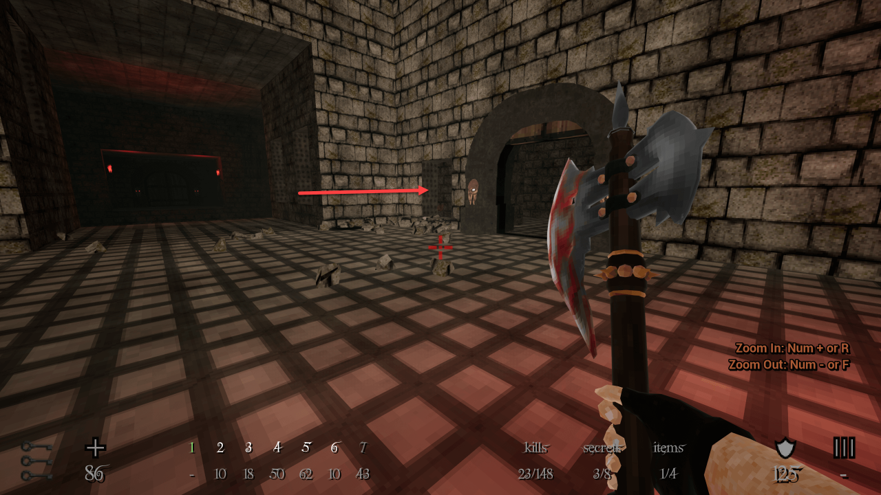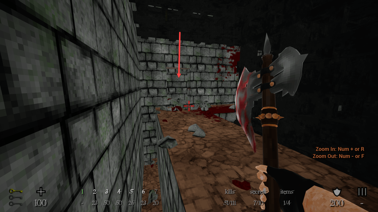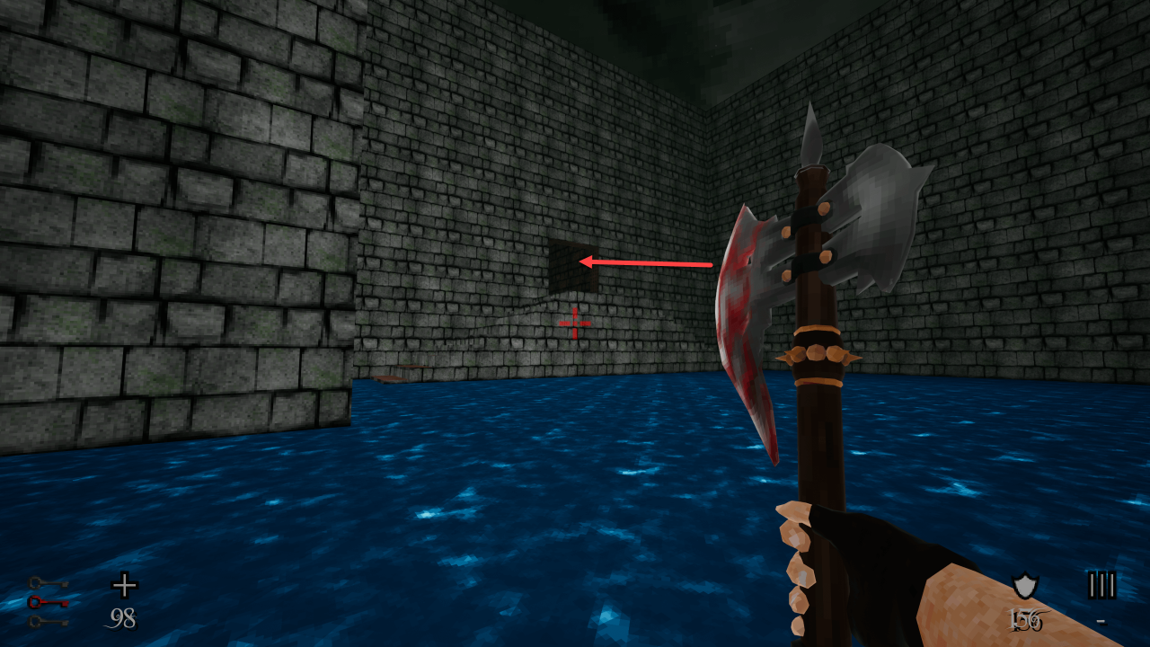 After picking up the red key, climb up the stairs and enter the next room. On the right, a skull switch, on the left, there’s a wall with a small pool of blood and two skulls pouring out blood. The wall bewteen them is destroyable.