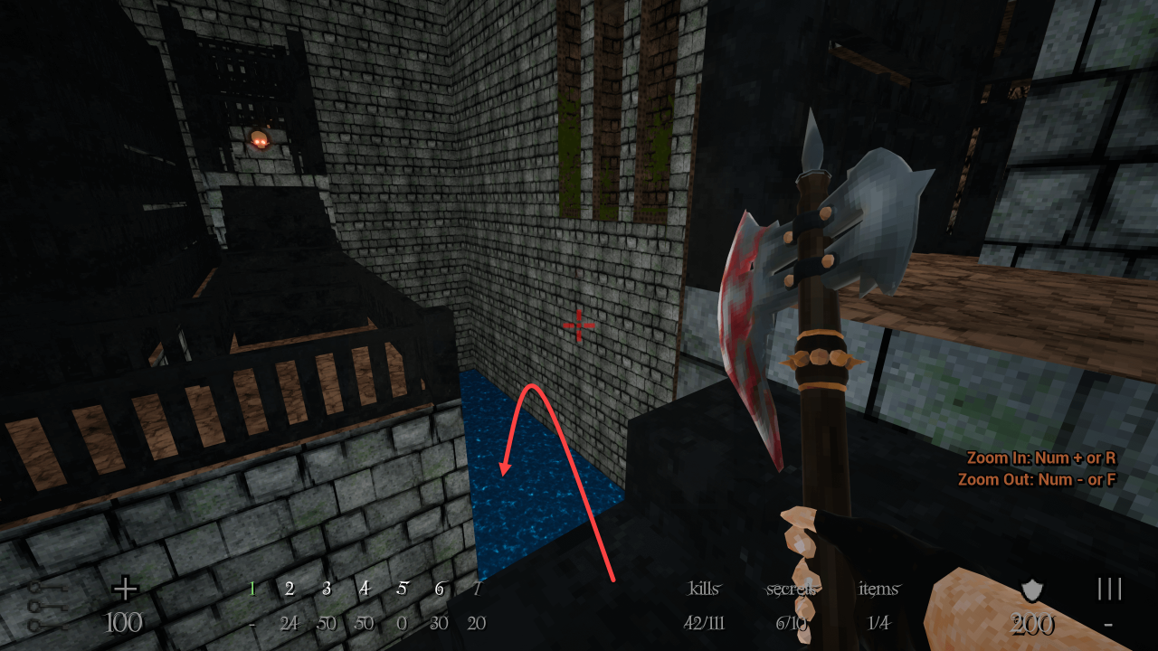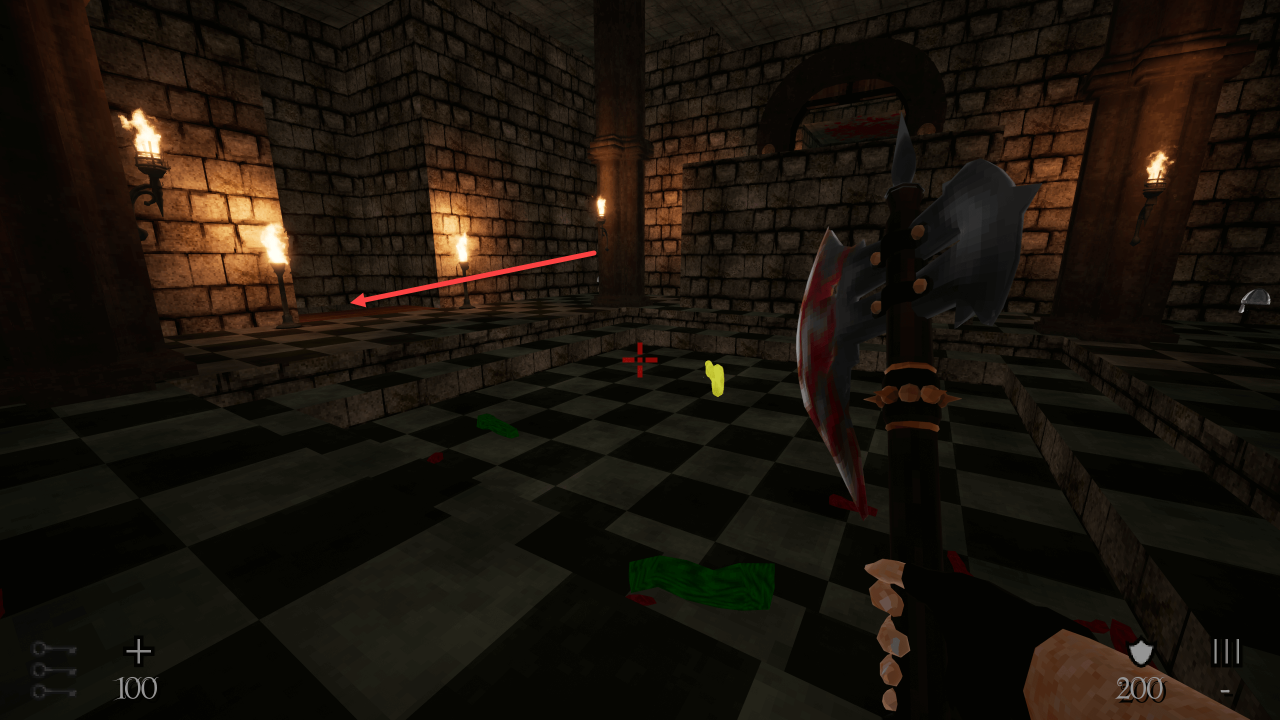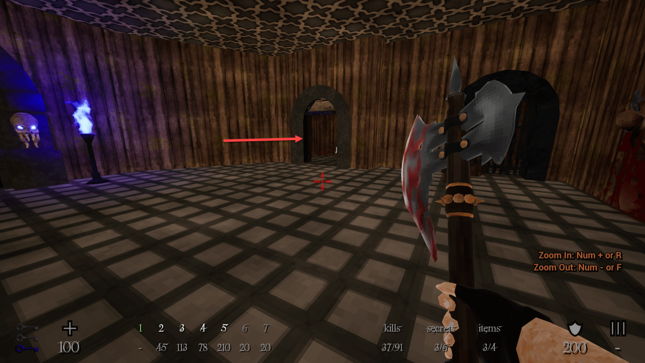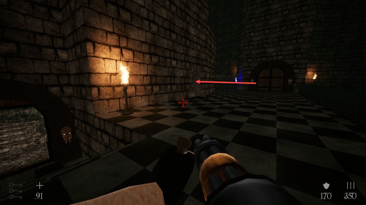 After picking up the red key, climb up the stairs and enter the next room. On the right, a skull switch, on the left, there’s a wall with a small pool of blood and two skulls pouring out blood. The wall bewteen them is destroyable.
