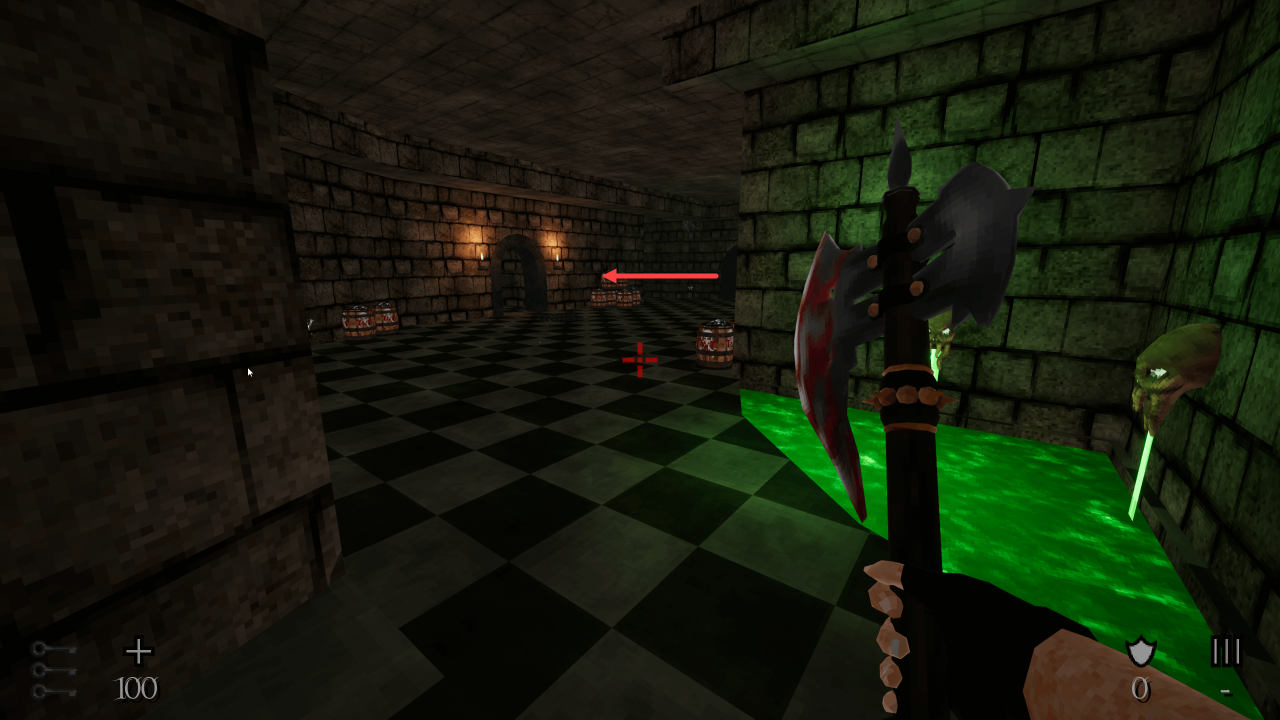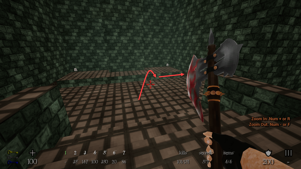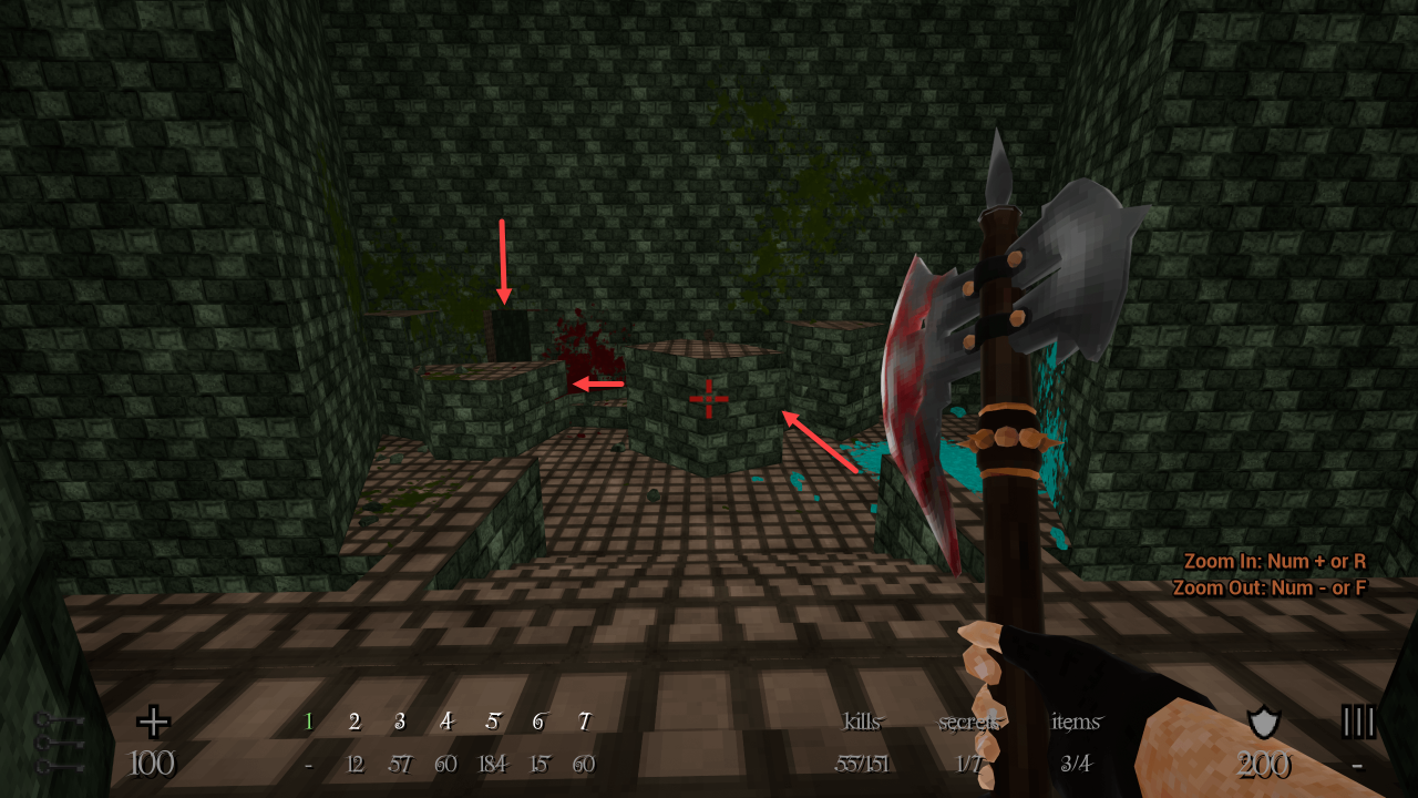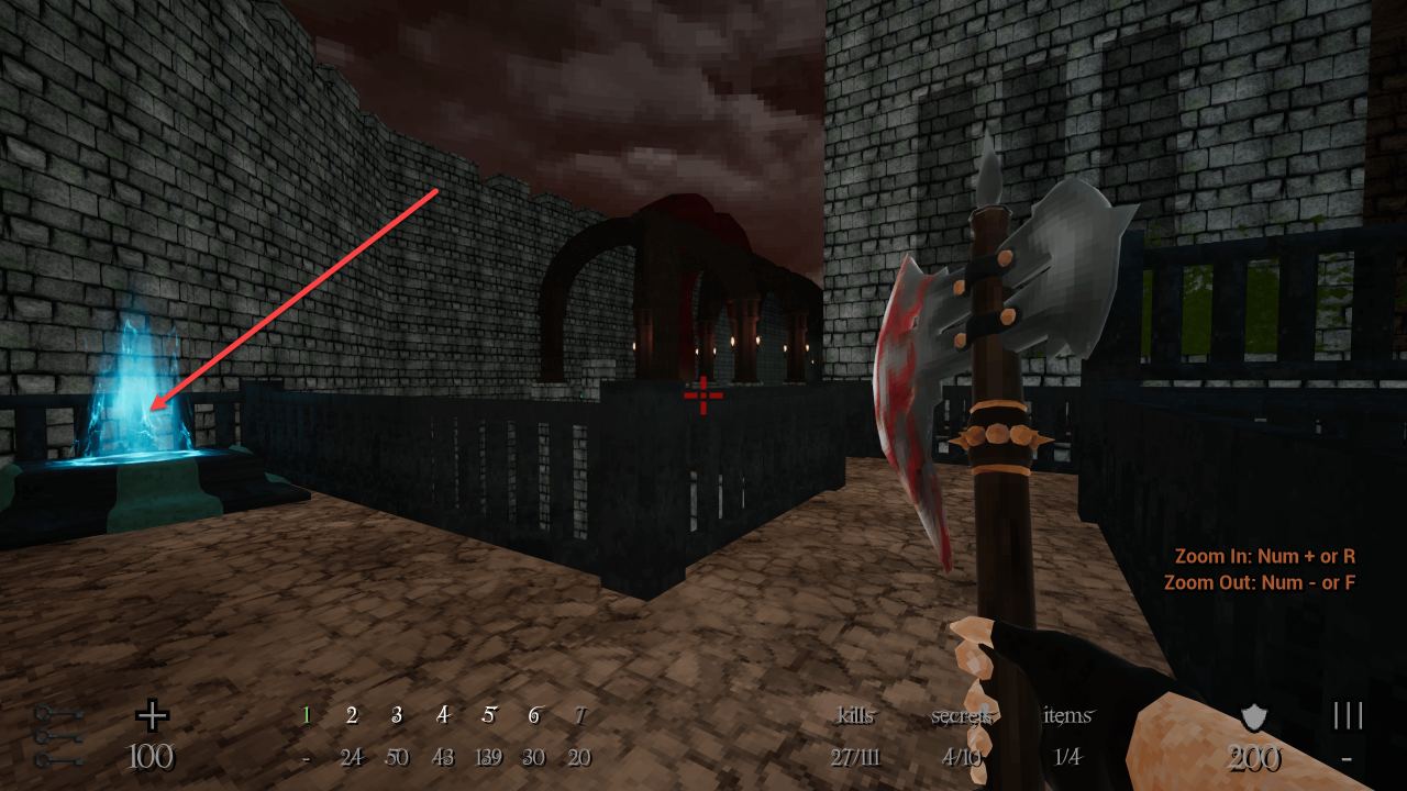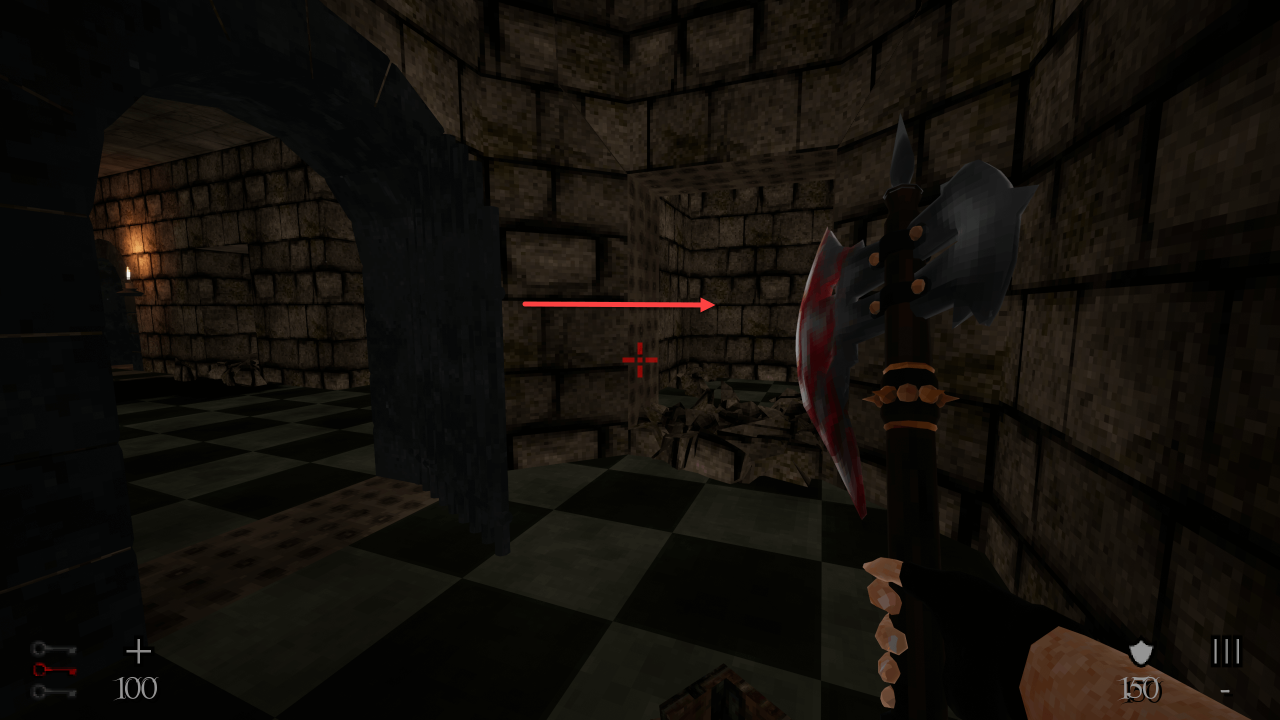 After picking up the red key, climb up the stairs and enter the next room. On the right, a skull switch, on the left, there’s a wall with a small pool of blood and two skulls pouring out blood. The wall bewteen them is destroyable.